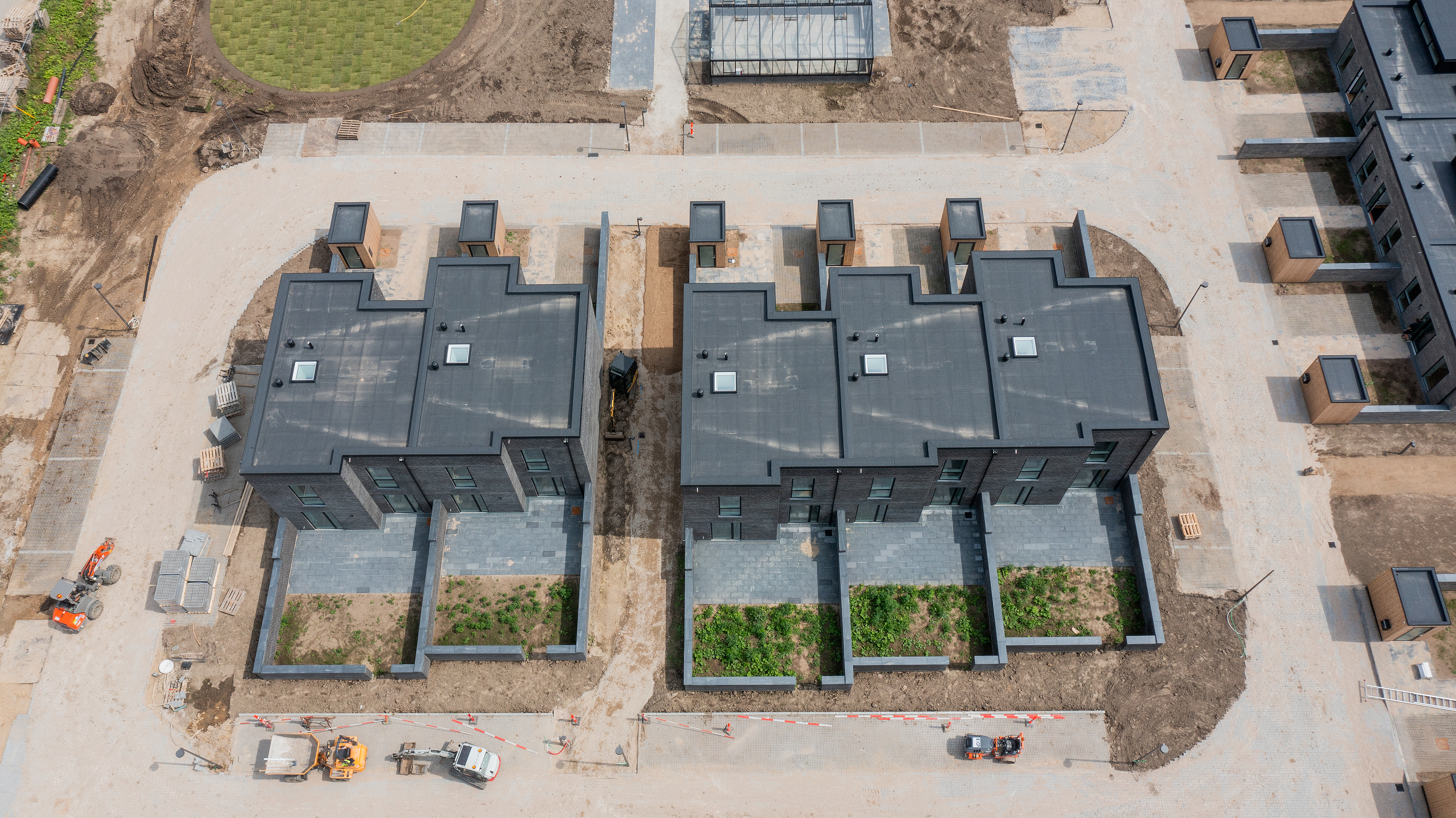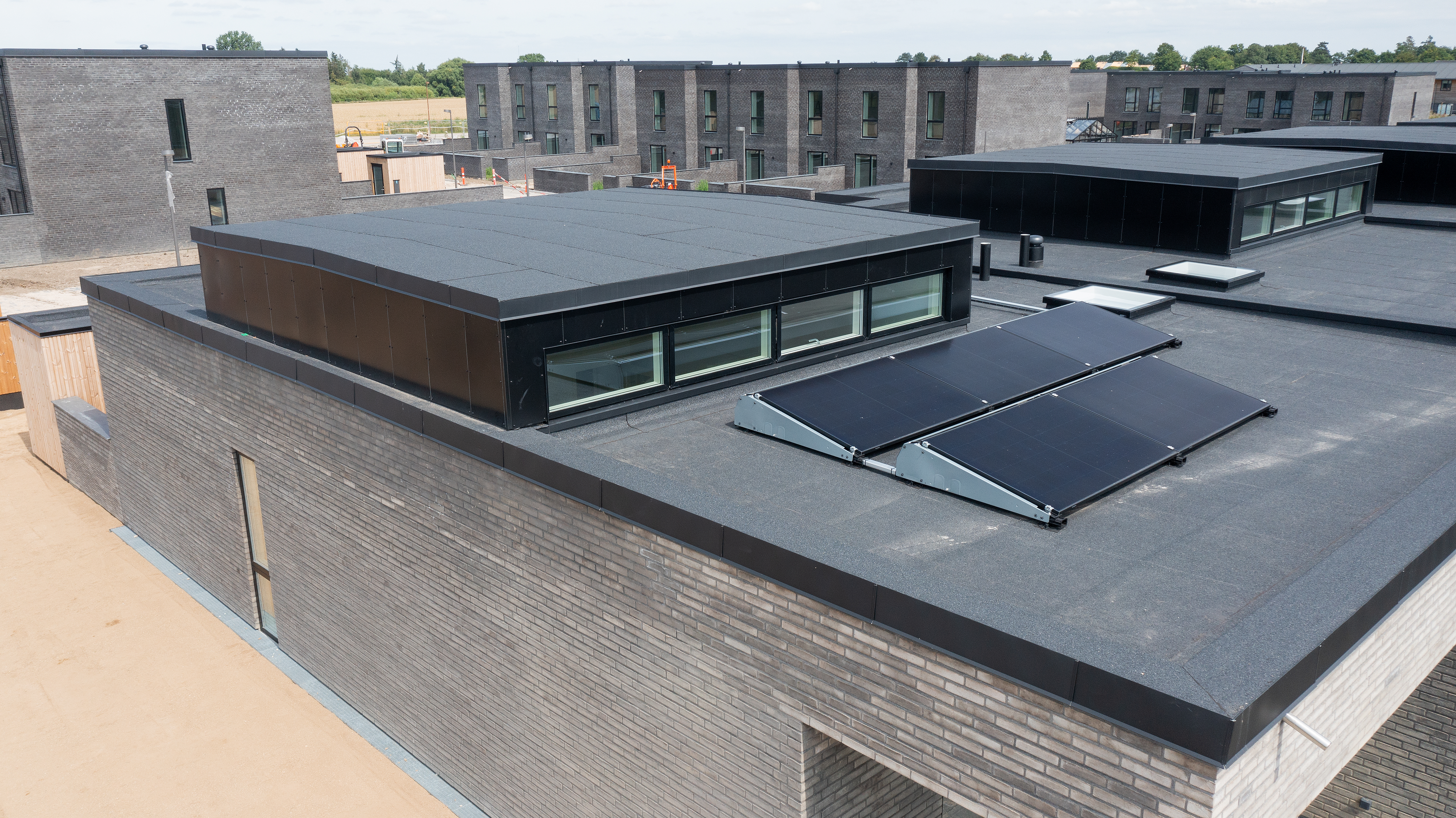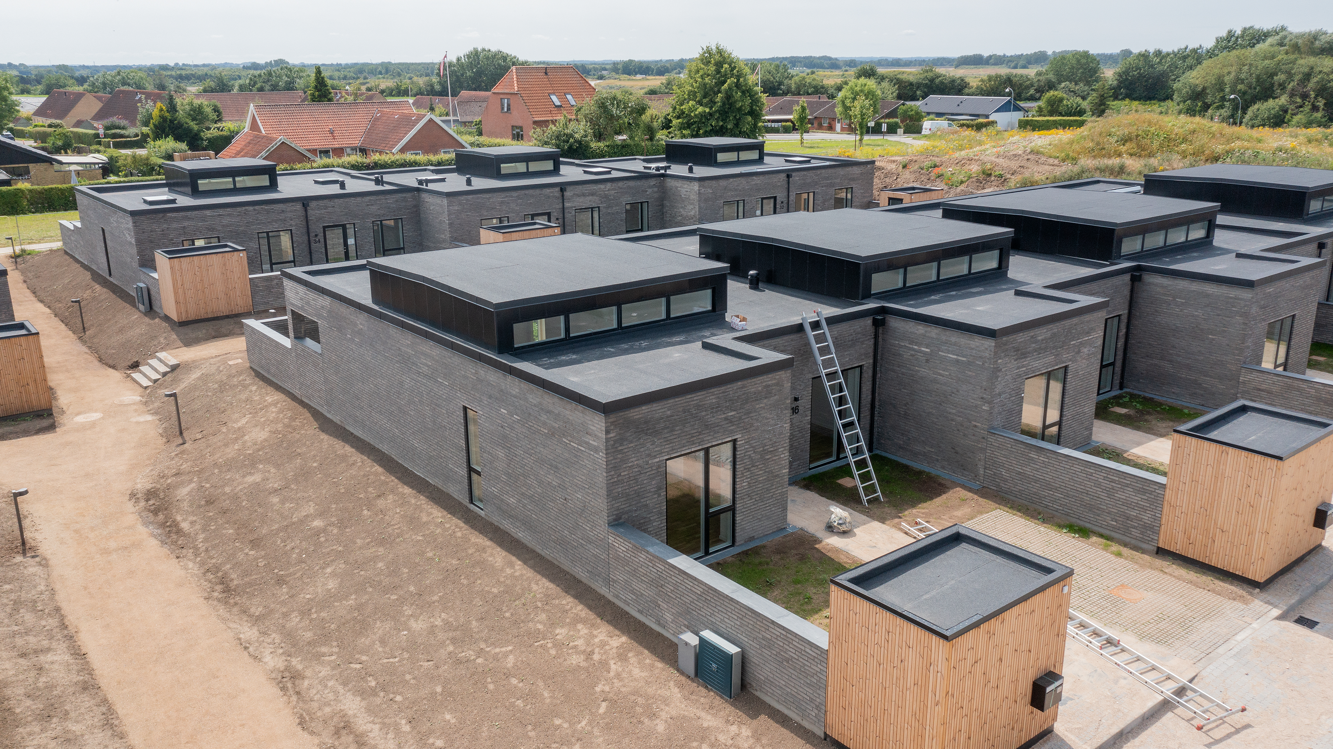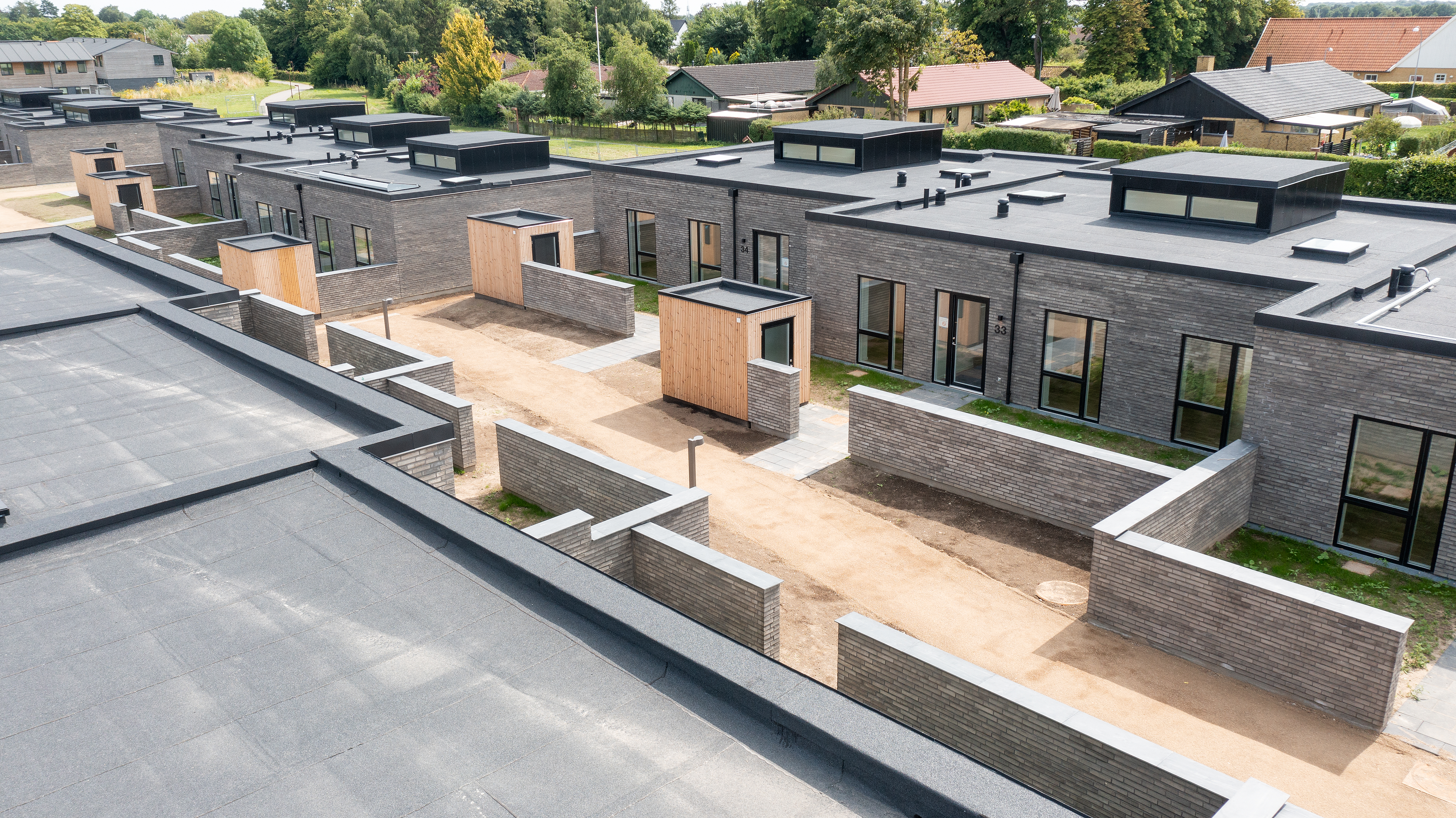 De flade tagpaptage giver rum hele vejen op og muliggør lysindfaldet. Forstærket af hævede ”taghatte” brydes f laden og visuelt skabes en rolig afslutning. Boligerne er orienteret i landskabet med kig ud i de grønne udeområder og fællesarealer.