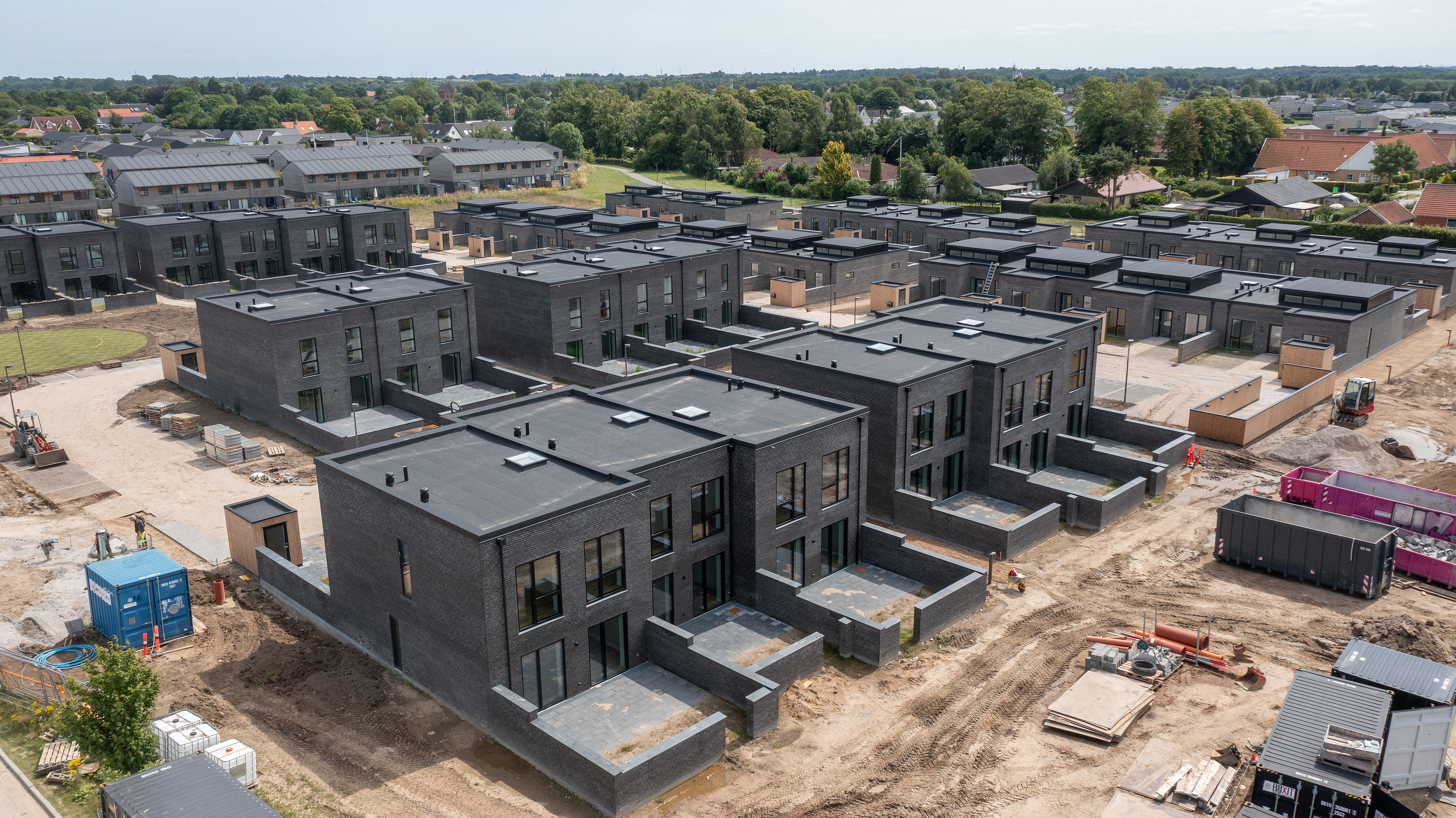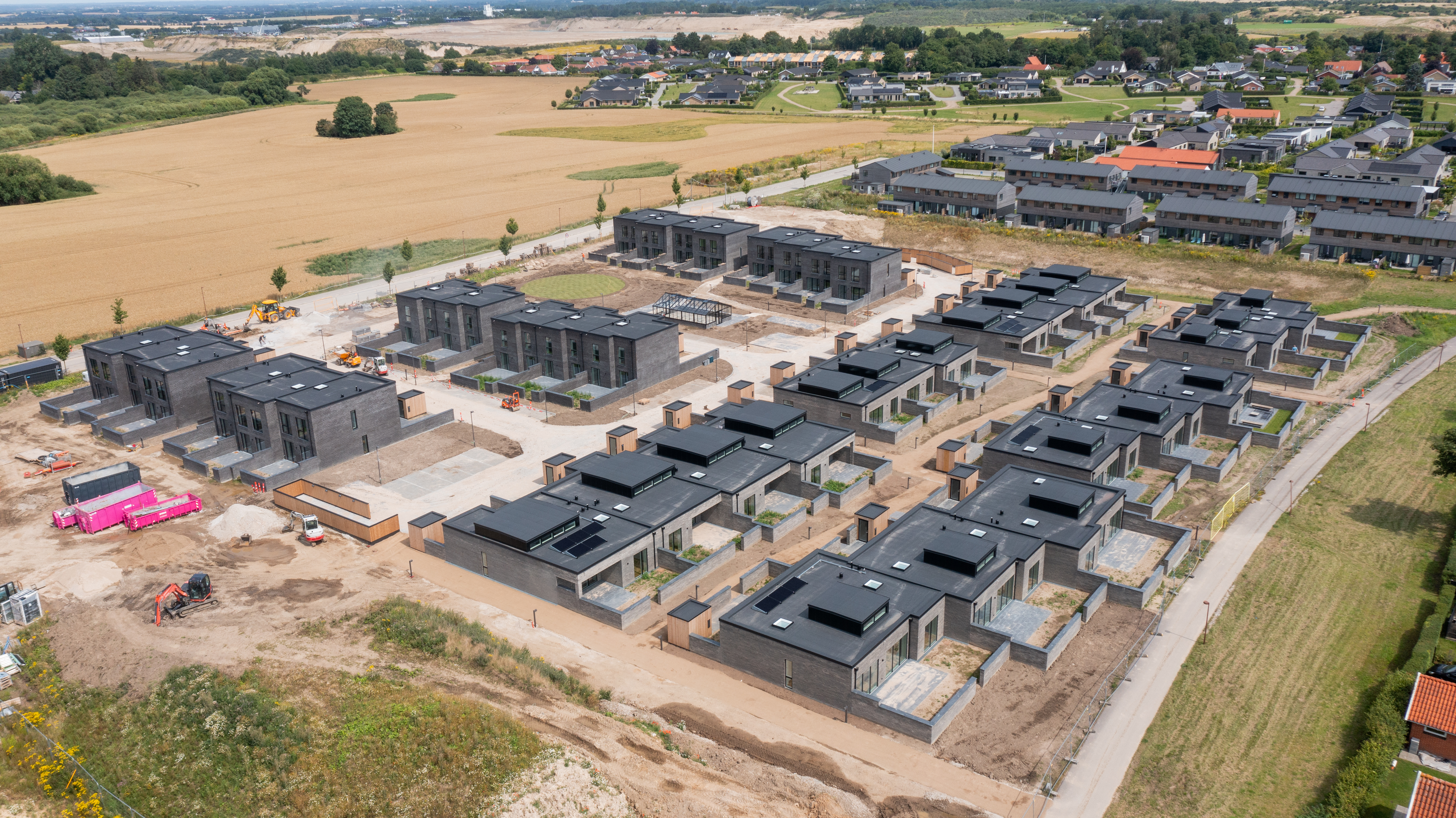 De 39 dobbelt- og række- huse i et og to plan i den nyere del af Vindinge tæt på Roskilde er designet minimalistisk med inspiration fra Bauhaus-traditionen og Utzons Fredensborghuse fra 1963.