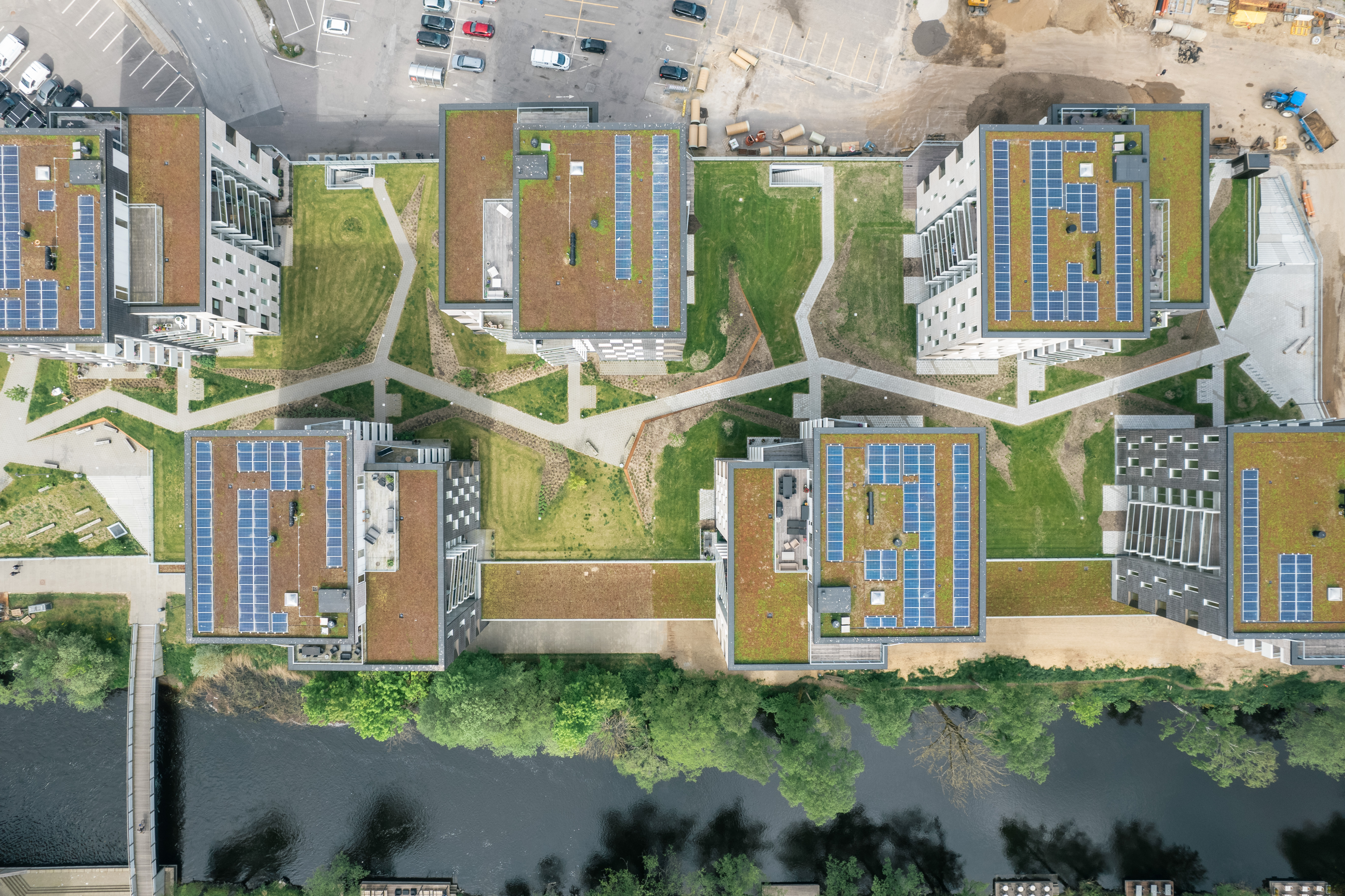 Der arbejdes i projektet med tagpap, grønne sedumtage og solceller. Bygningerne er Svanemærket.