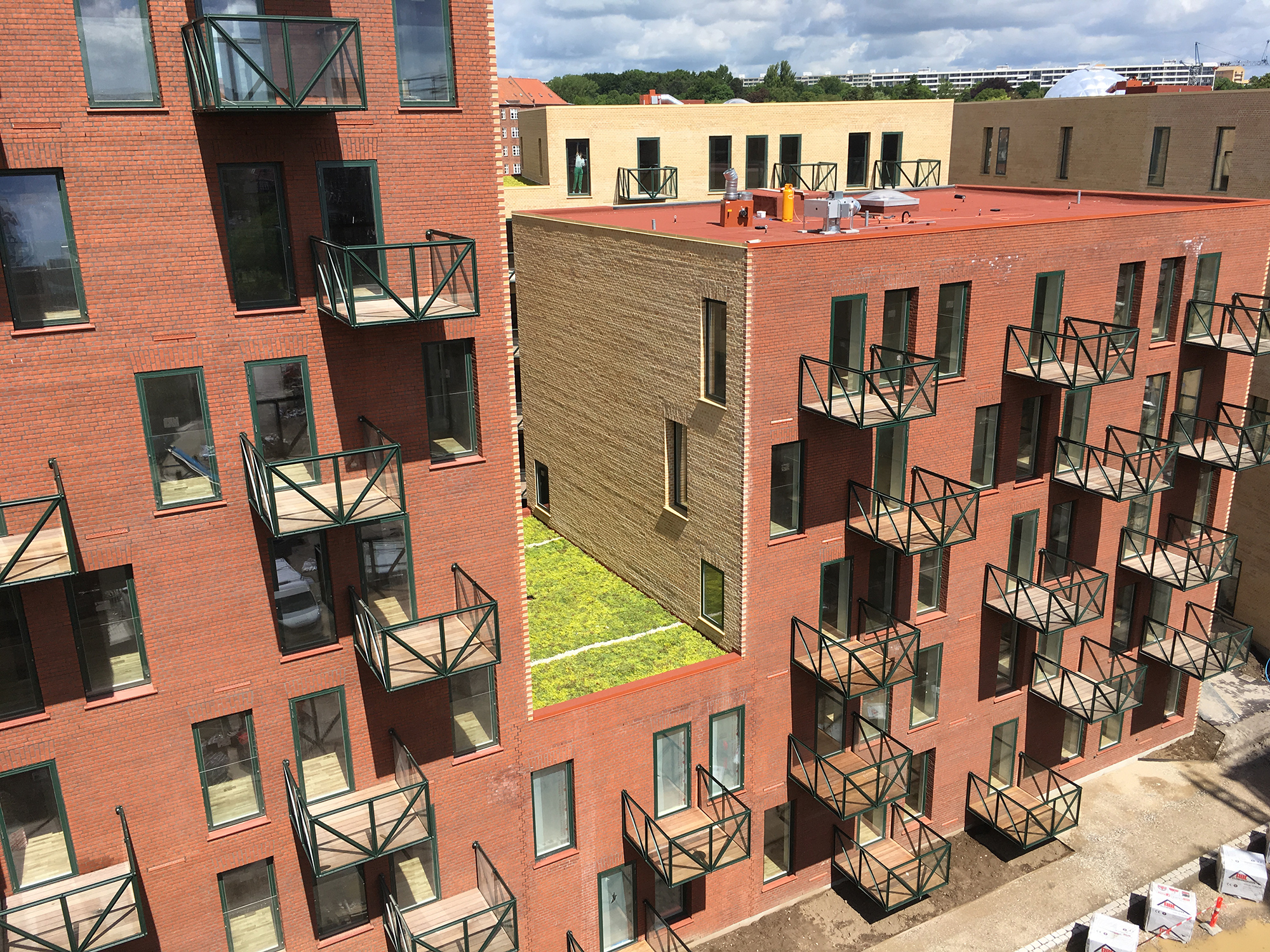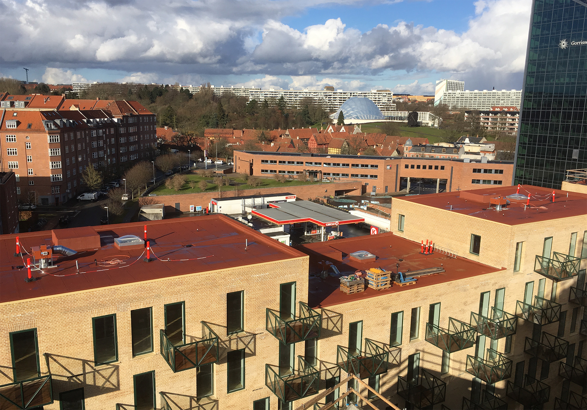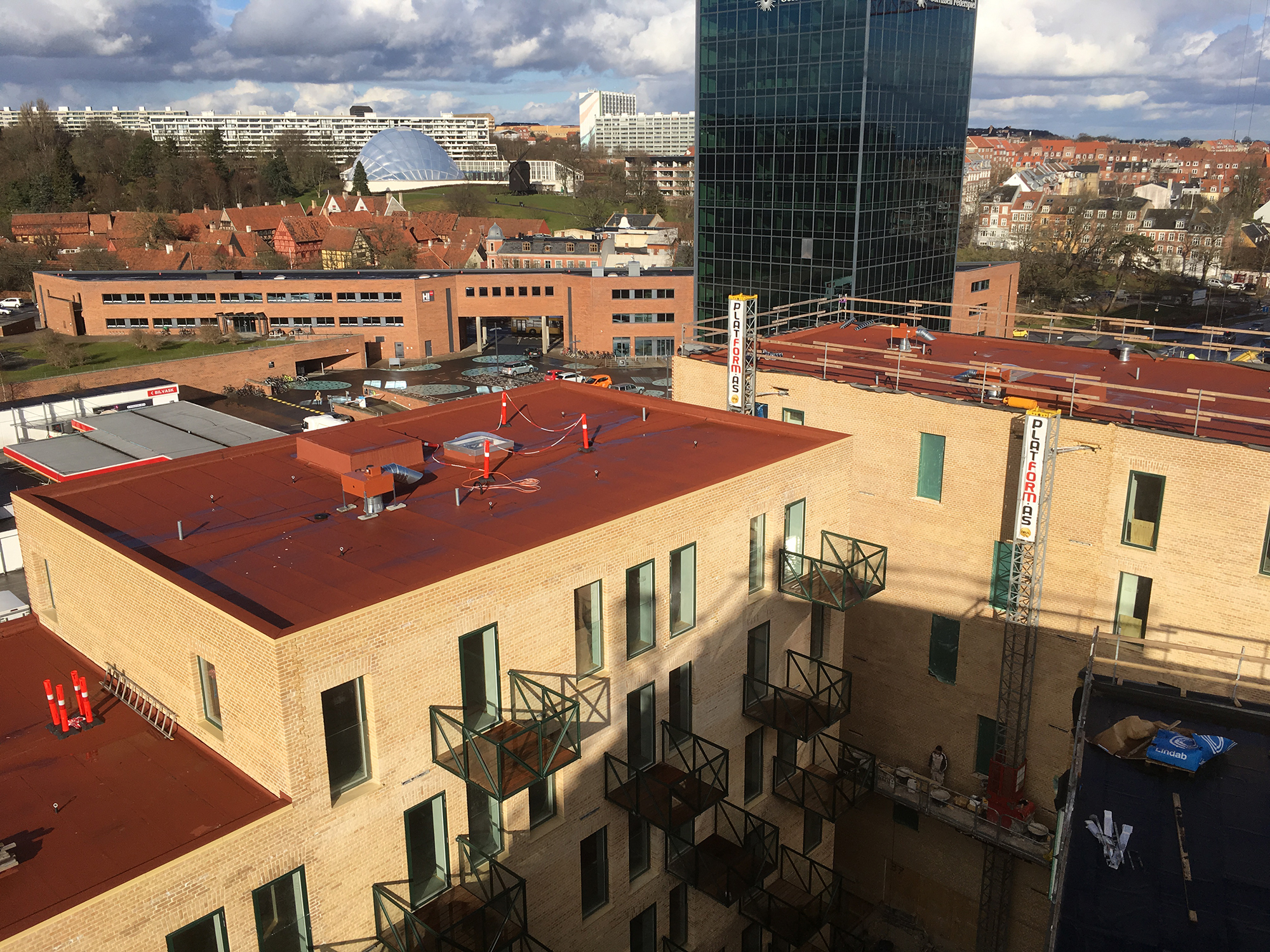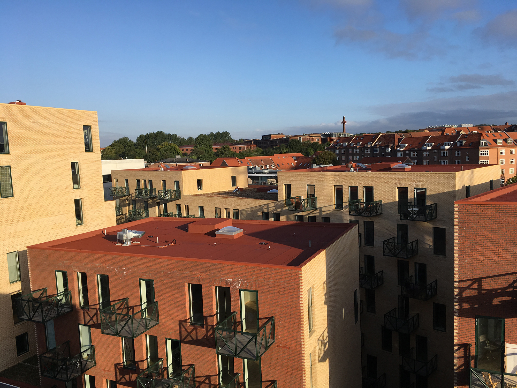 I Lottrupgården i Ceresbyen i Aarhus har arkitekten valgt tagpap i rød farve. Tagfladen understøtter dermed bygningernes bevidst storbyagtige udtryk og skift mellem forskellige farver.