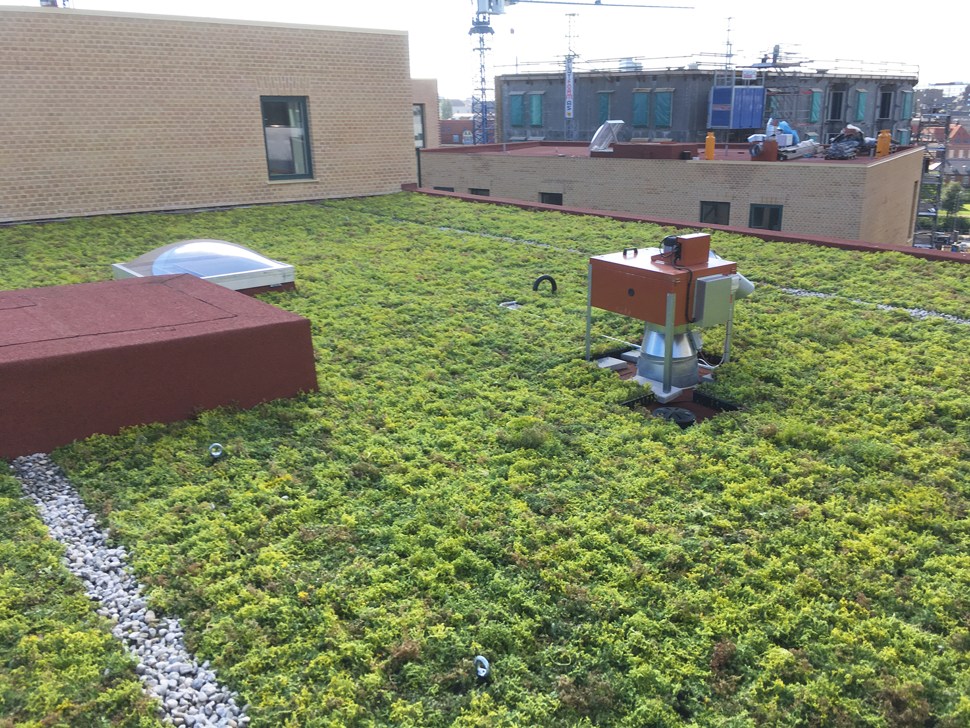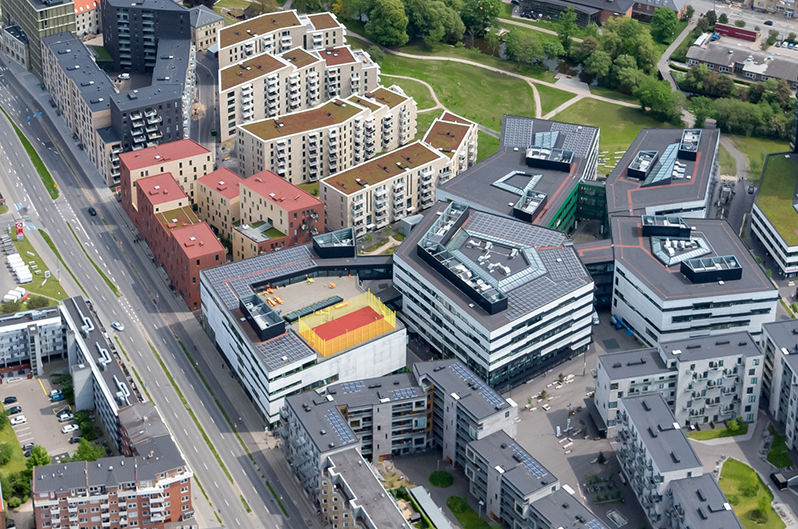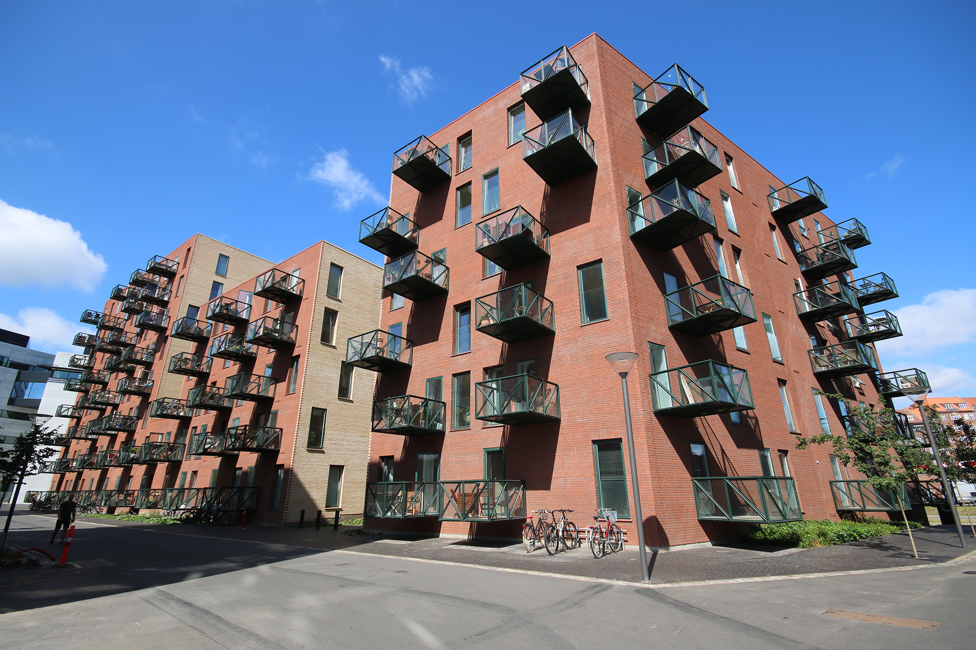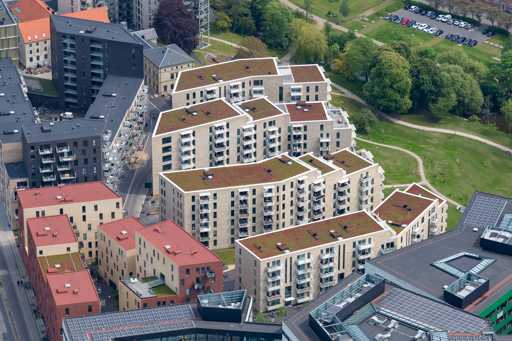 I Lottrupgården i Ceresbyen i Aarhus har arkitekten valgt tagpap i rød farve. Tagfladen understøtter dermed bygningernes bevidst storbyagtige udtryk og skift mellem forskellige farver.