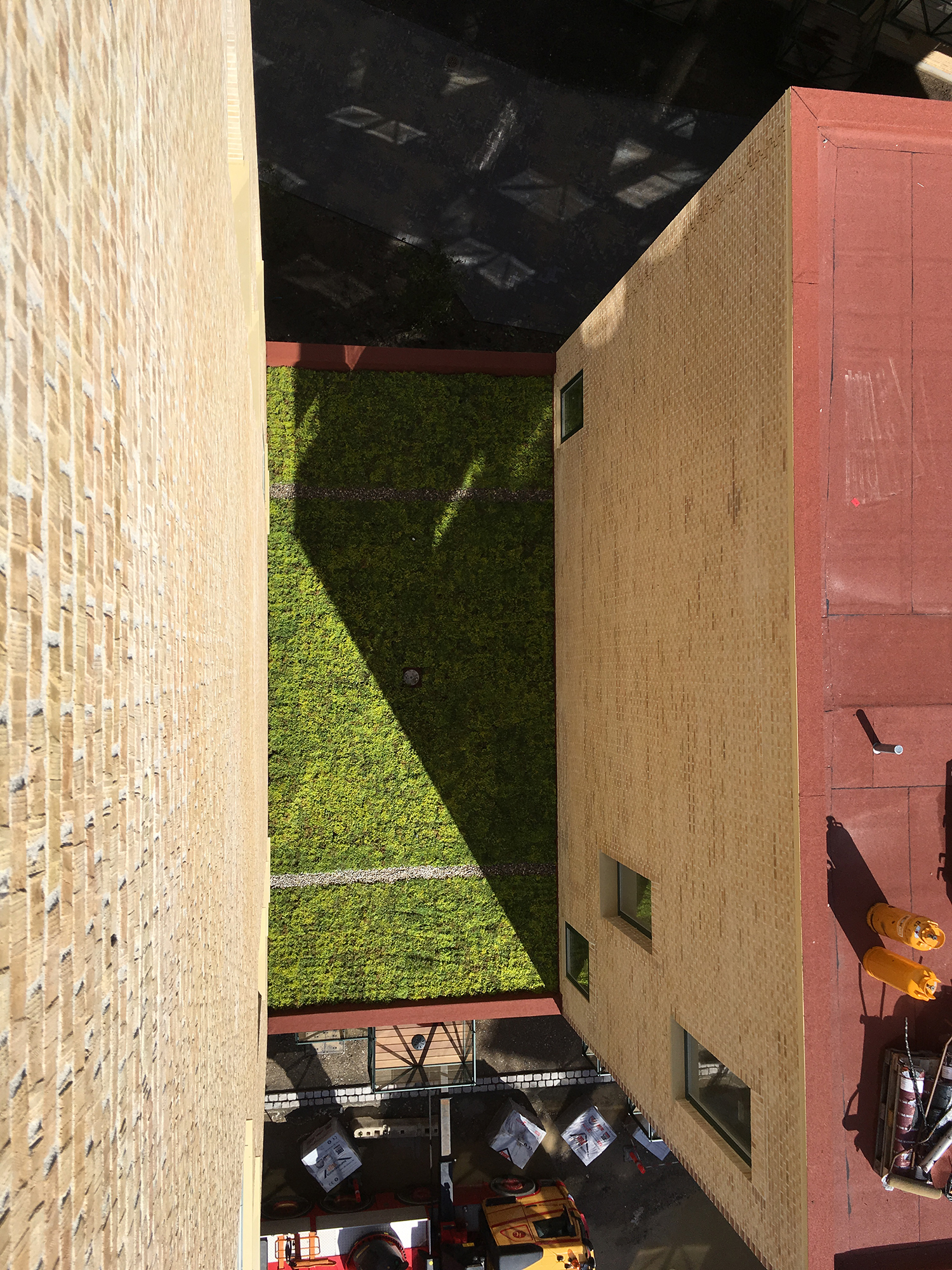 I den gennemtænkte arkitektur er der bevidste etagespring mellem to og otte etager, der visuelt virker som en slags skydeskår. Det giver variation og en meget levende tagprofil. Derved trækker bygningen forskellige højder og silhuetter himmelrummet ind i gården.