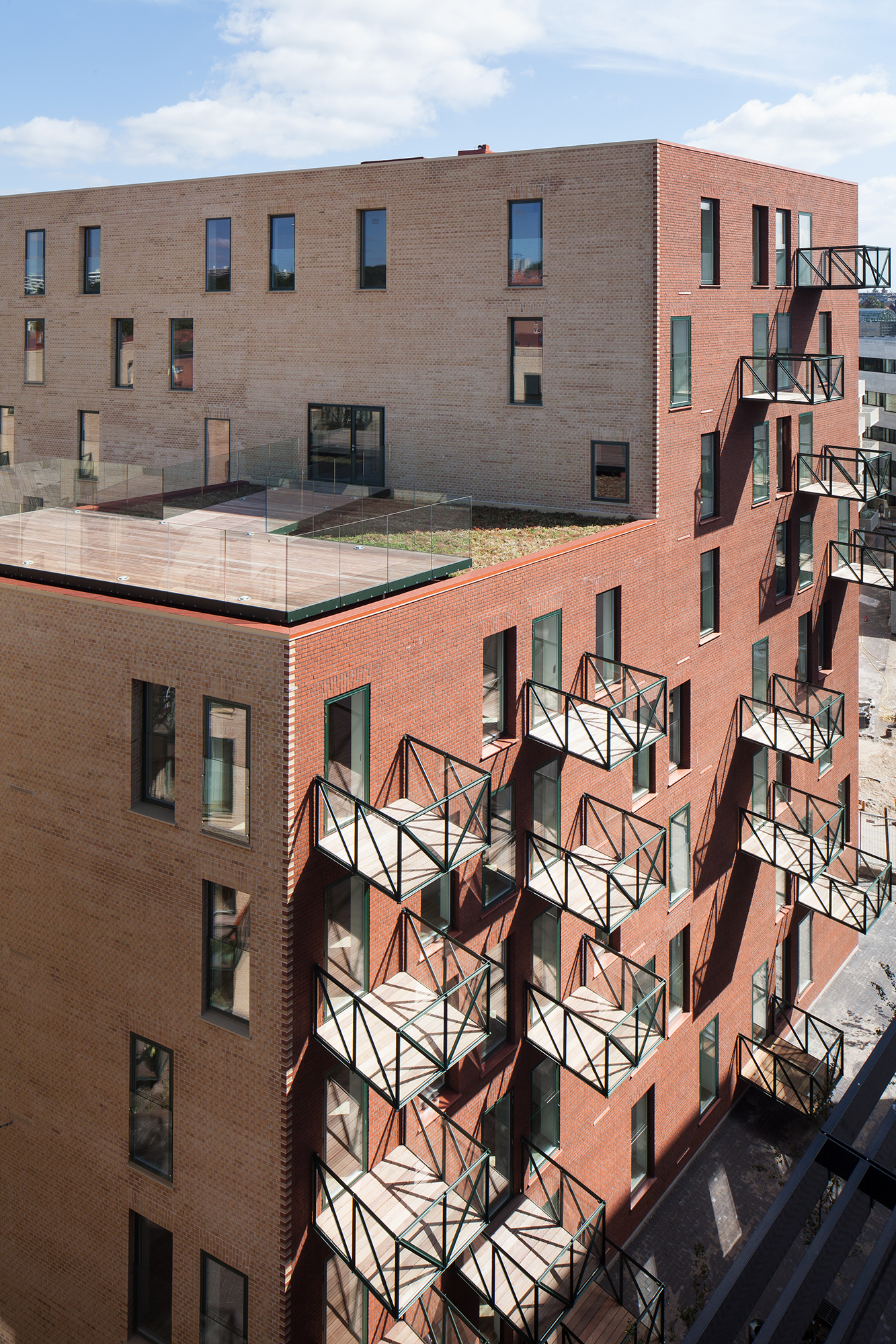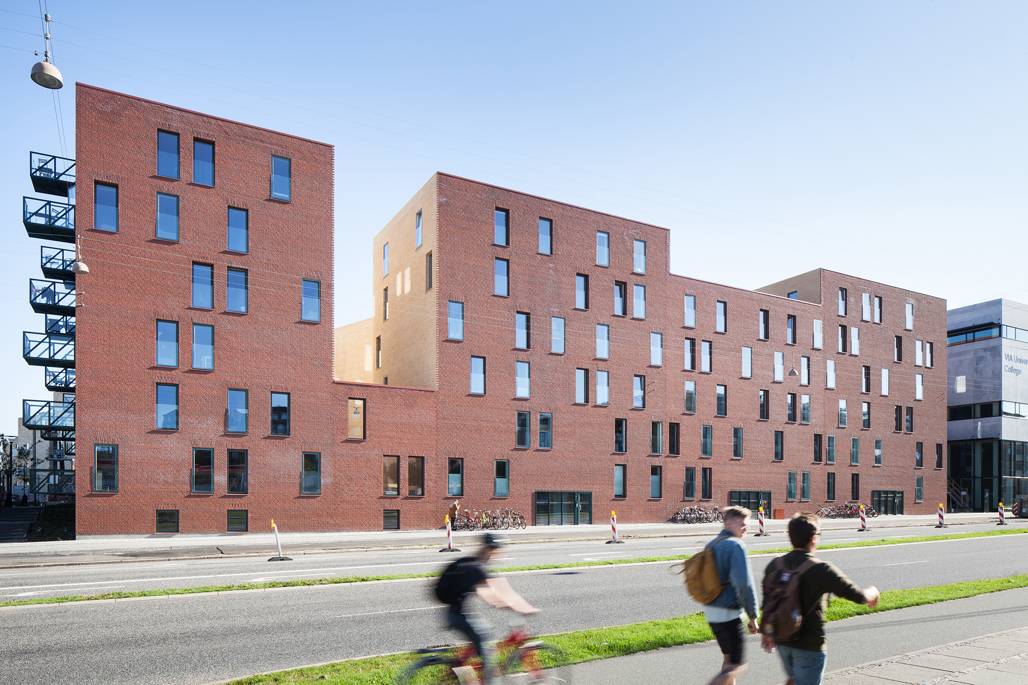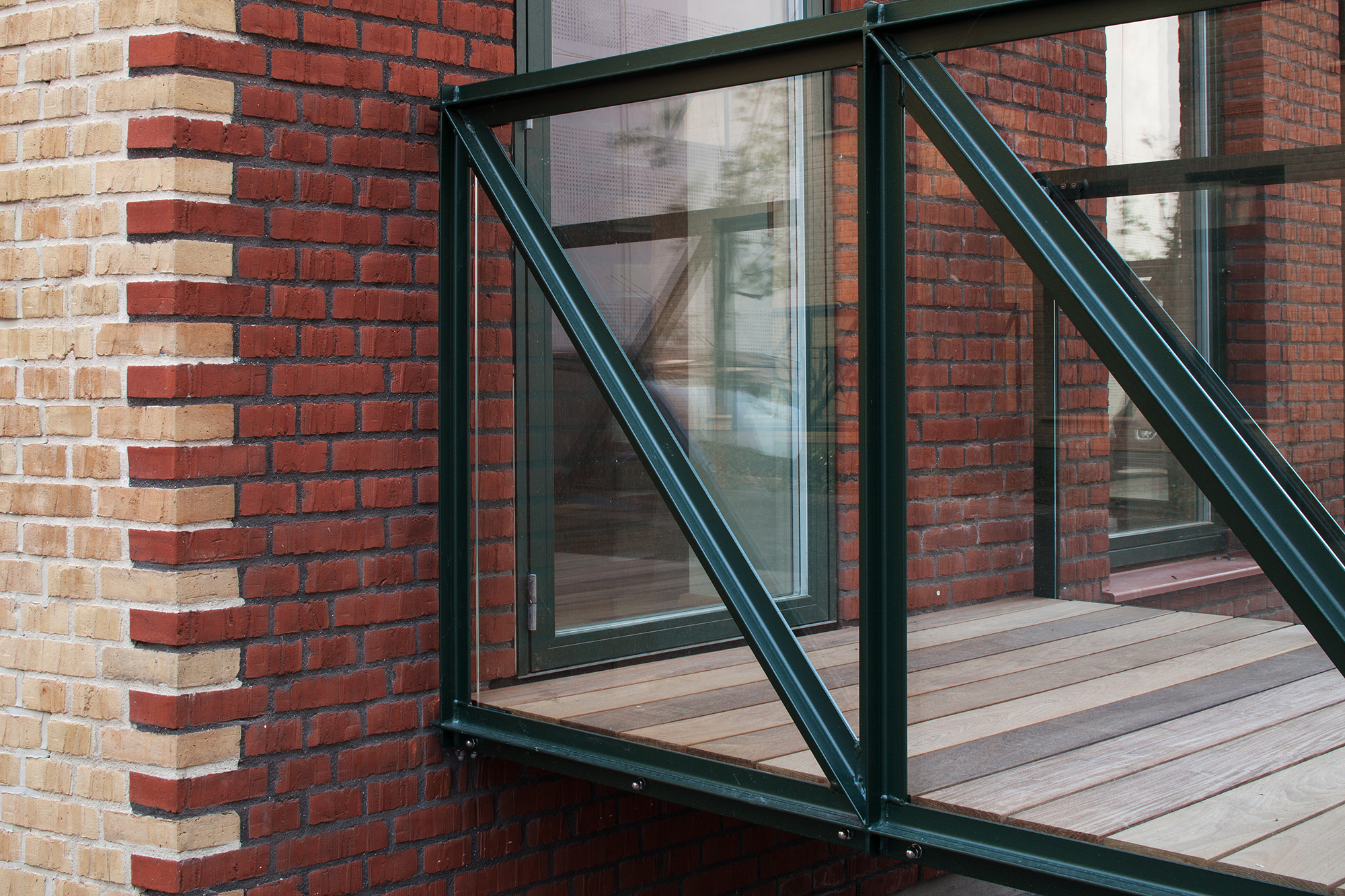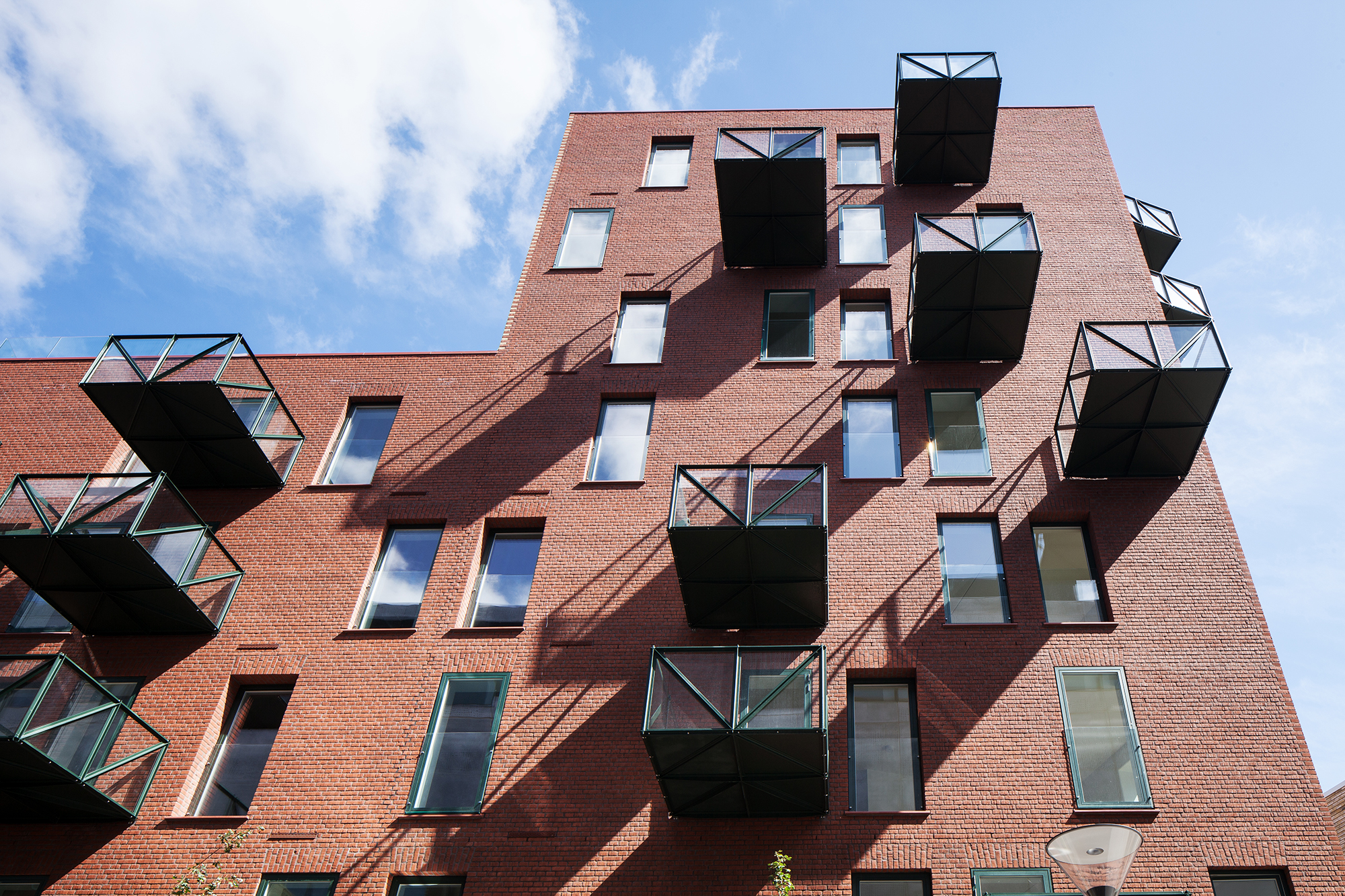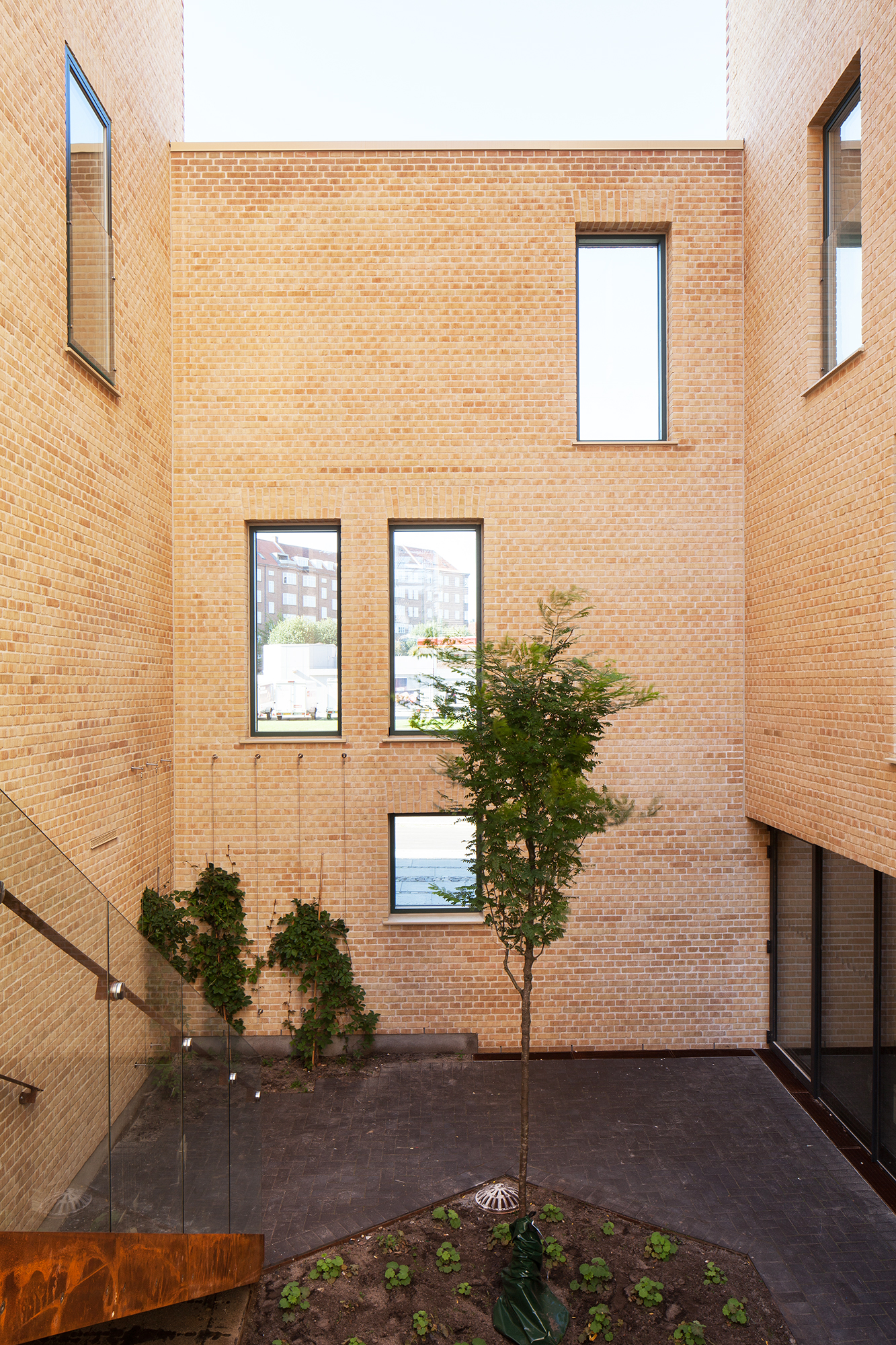 Teglfacaderne har fået et raffineret udtryk, hvor der arbejdes med en lys, gul side ind mod gården og en mørk rødbrun side ud mod gaden.