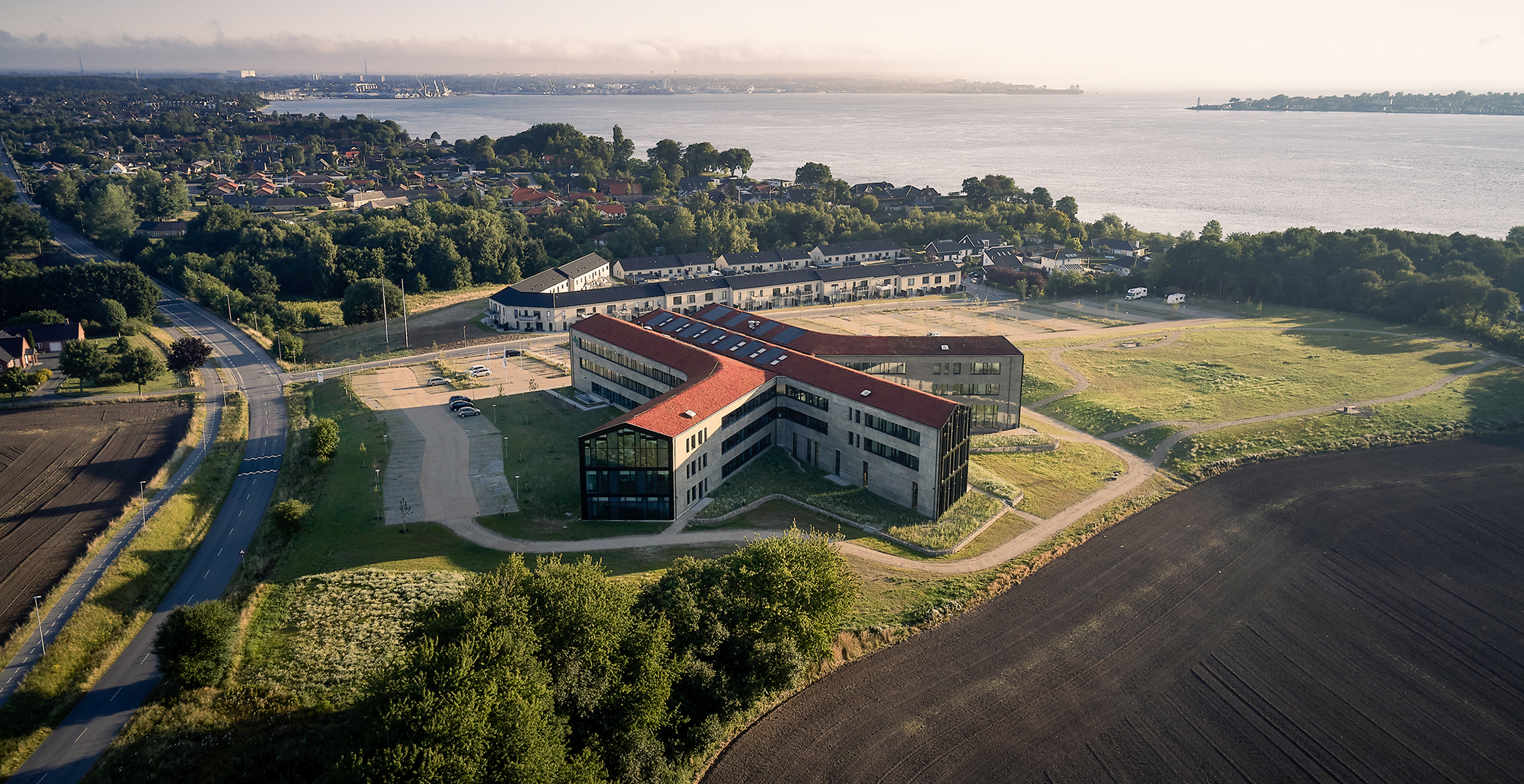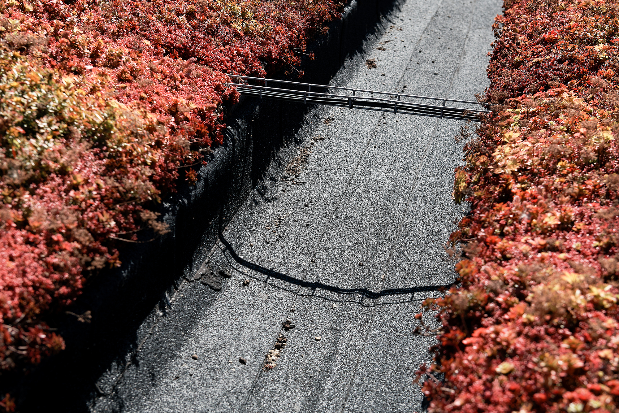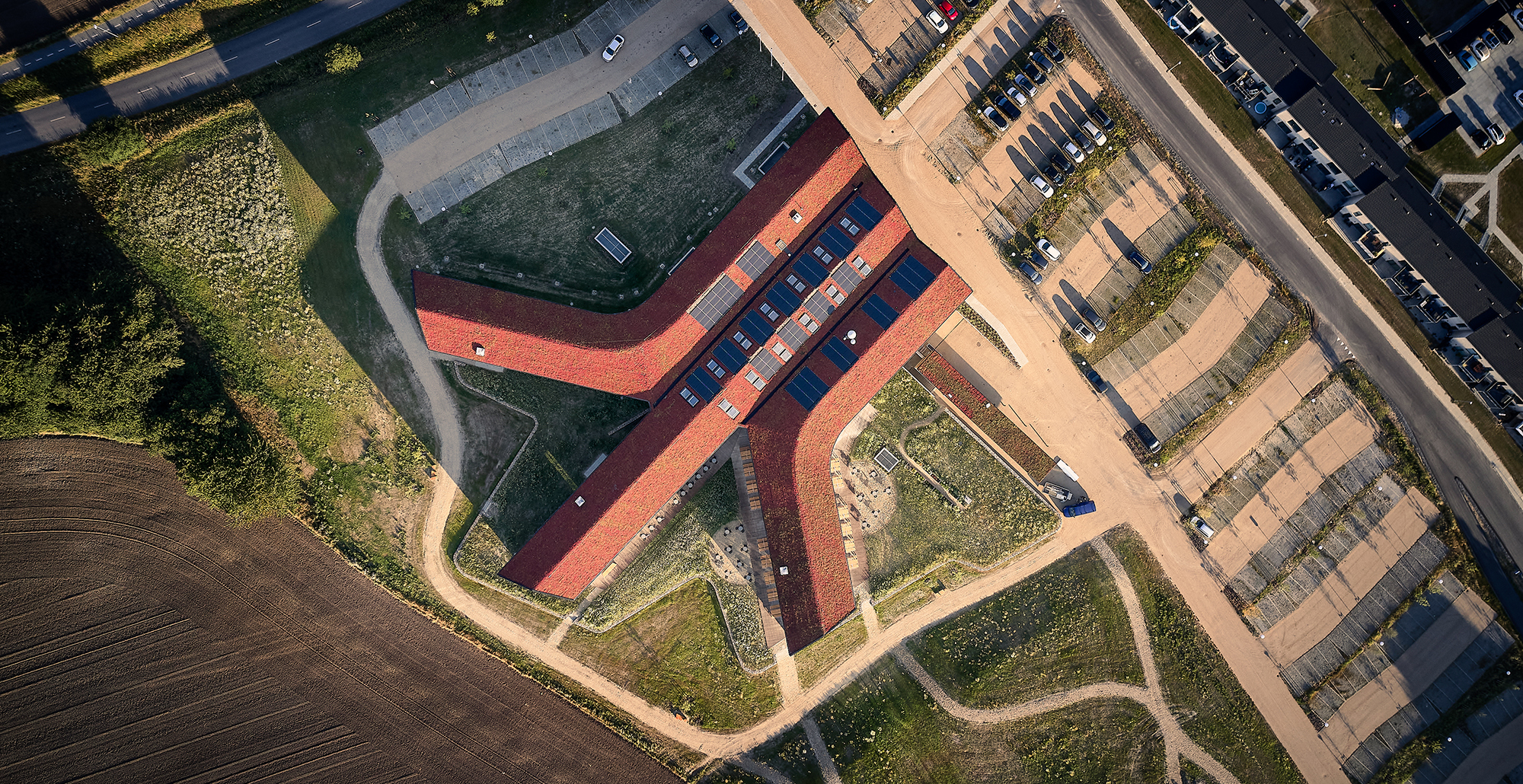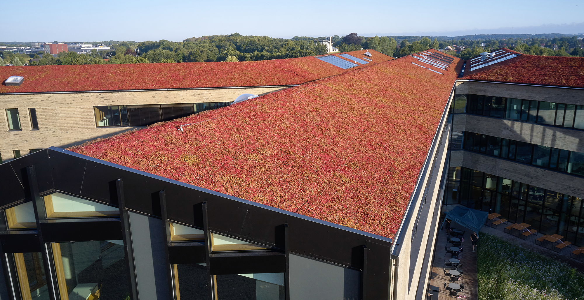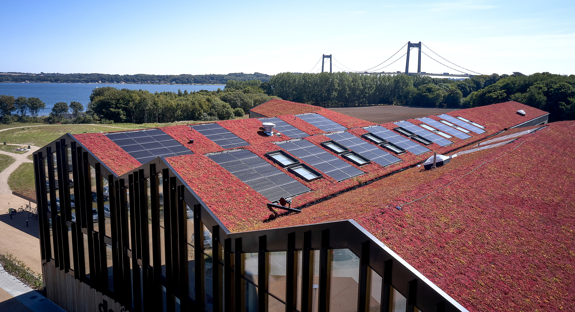 Det grønne sedumtag får bygningen til at falde ind i naturen. Ud over kvaliteterne i det grønne tags visuelle fremtræden bidrager det til at reducerer mængden af regnvand til kloakken.