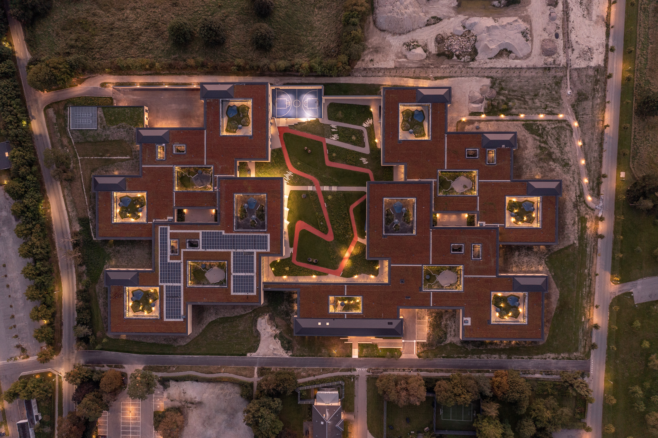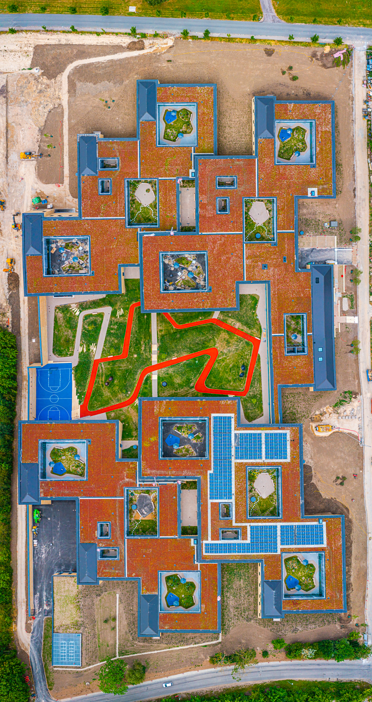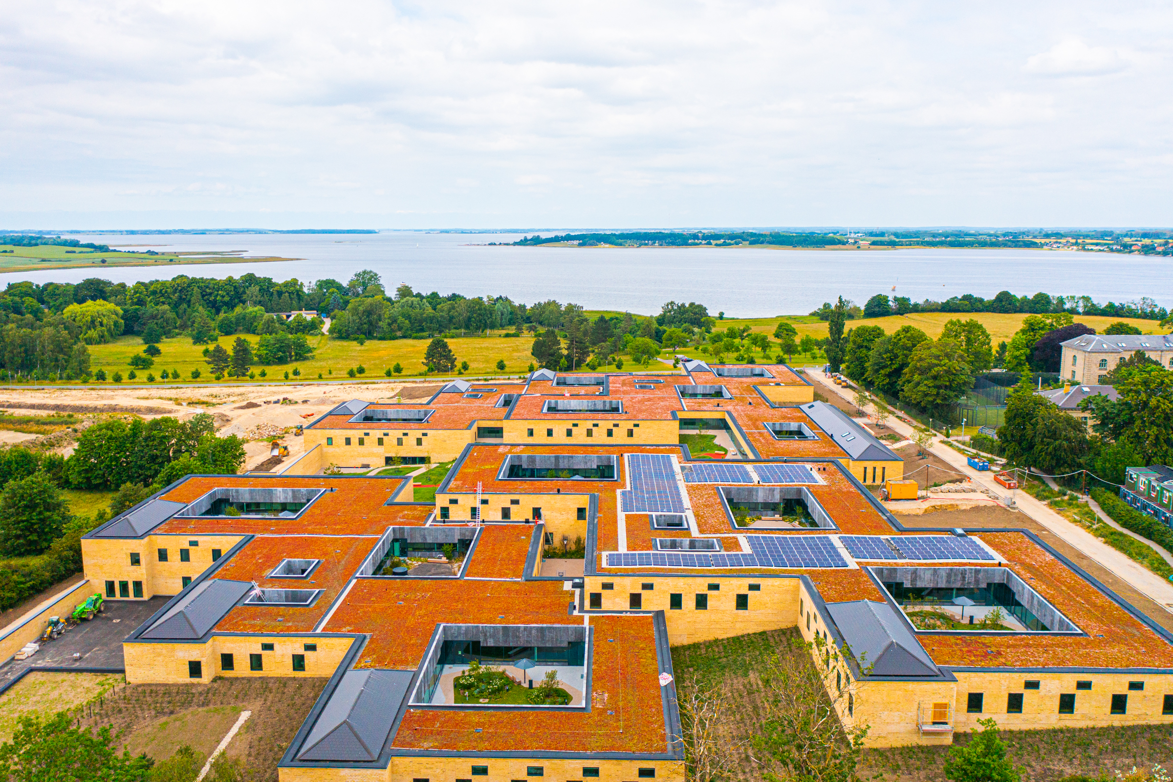 Bygningen i sig selv danner en ydermur, omkransende grønne fællesarealer og gårdrum. Et grønt sedumtag bidrager til byggeriets samlede udtryk.