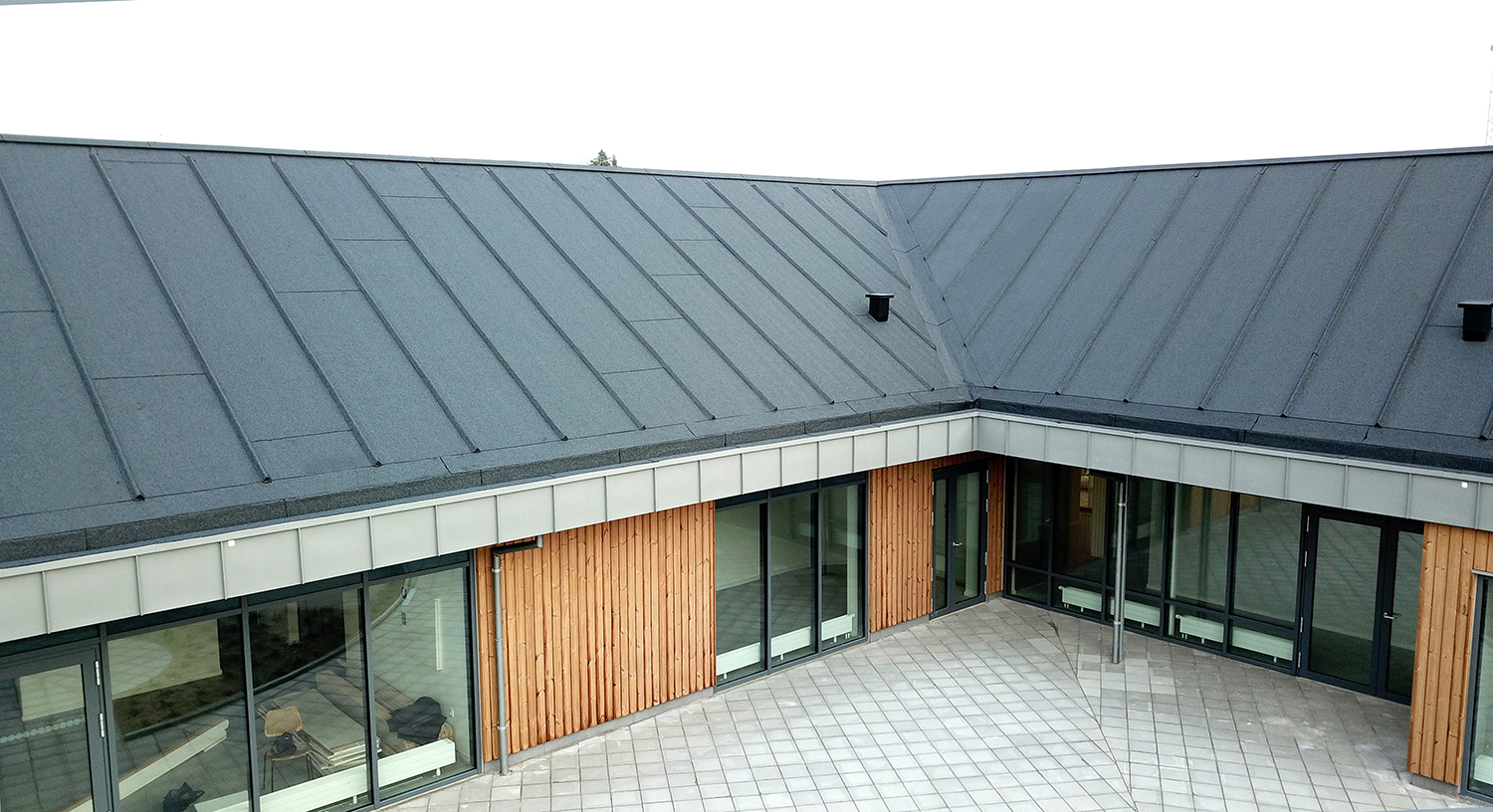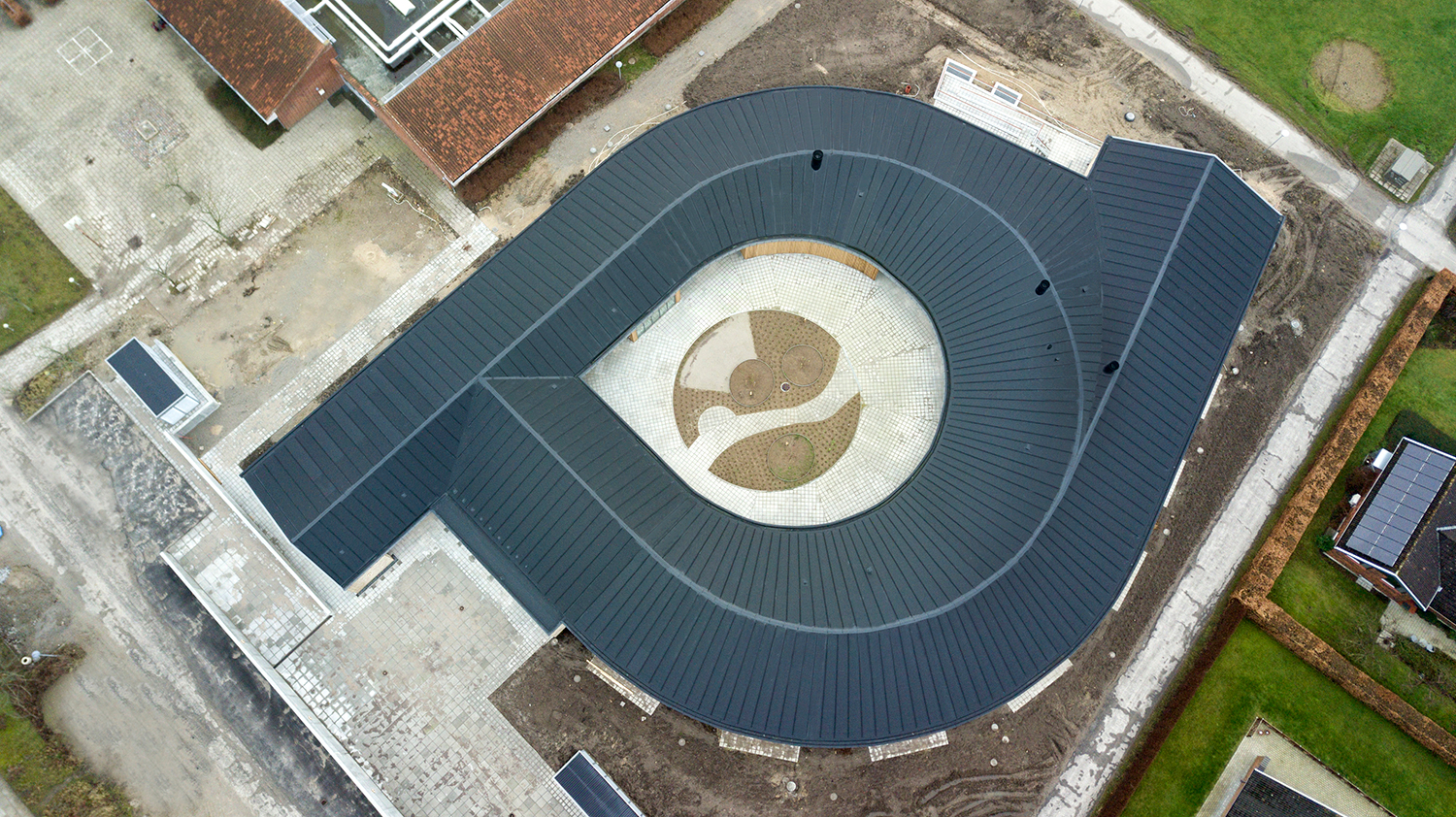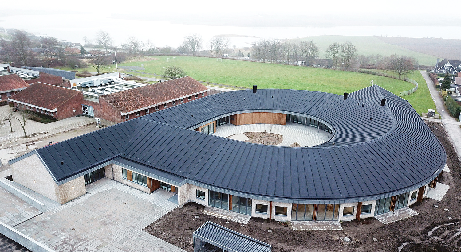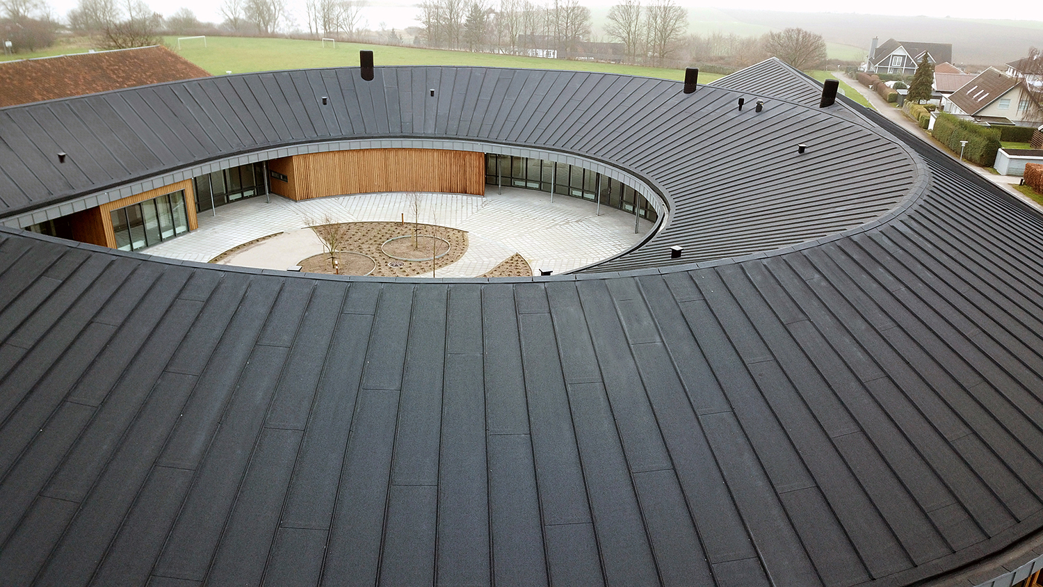 Bygningens listedækning viser de arkitektoniske muligheder for at etablerede kurvede flader, som materialets fleksibilitet giver.