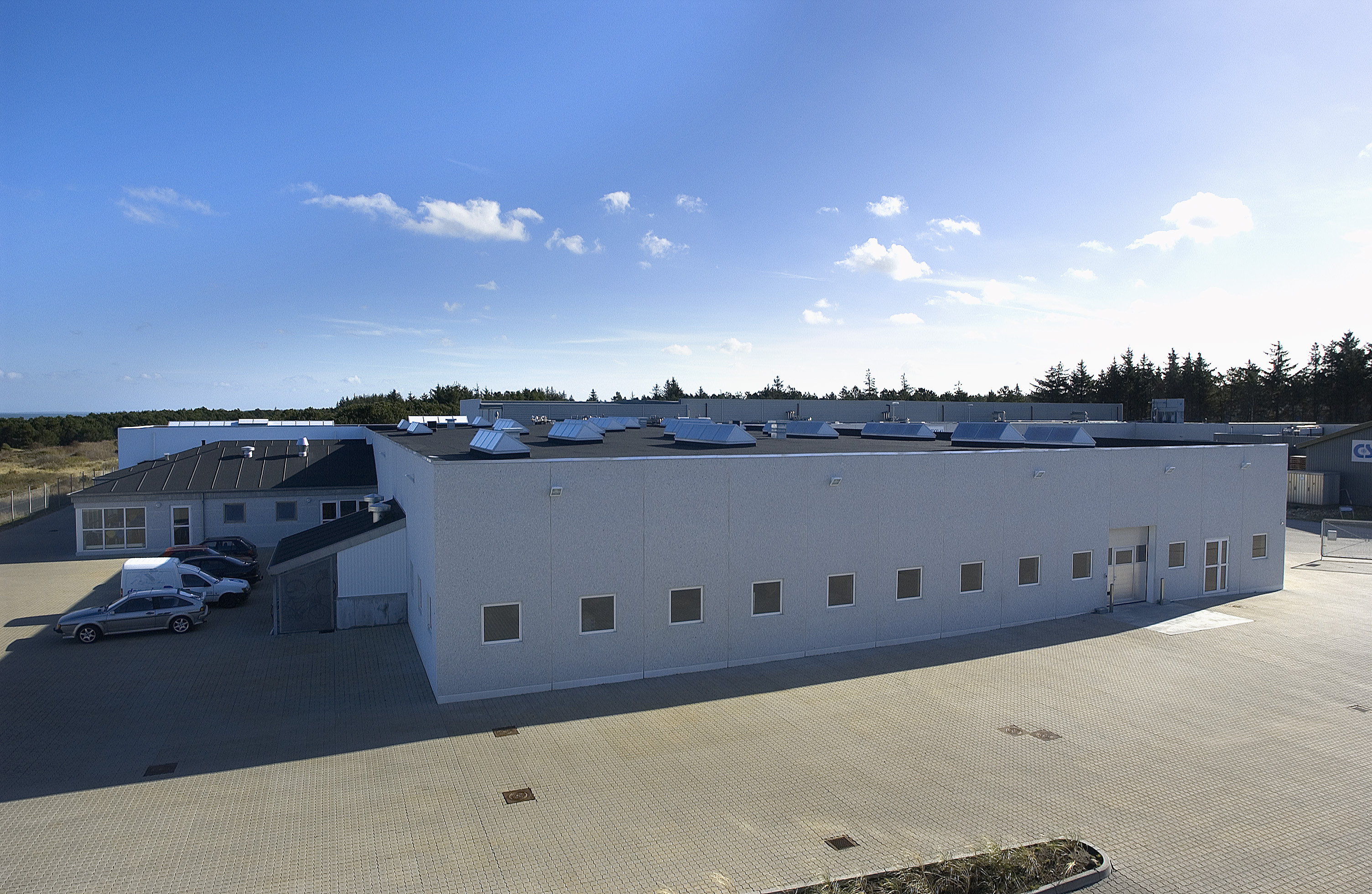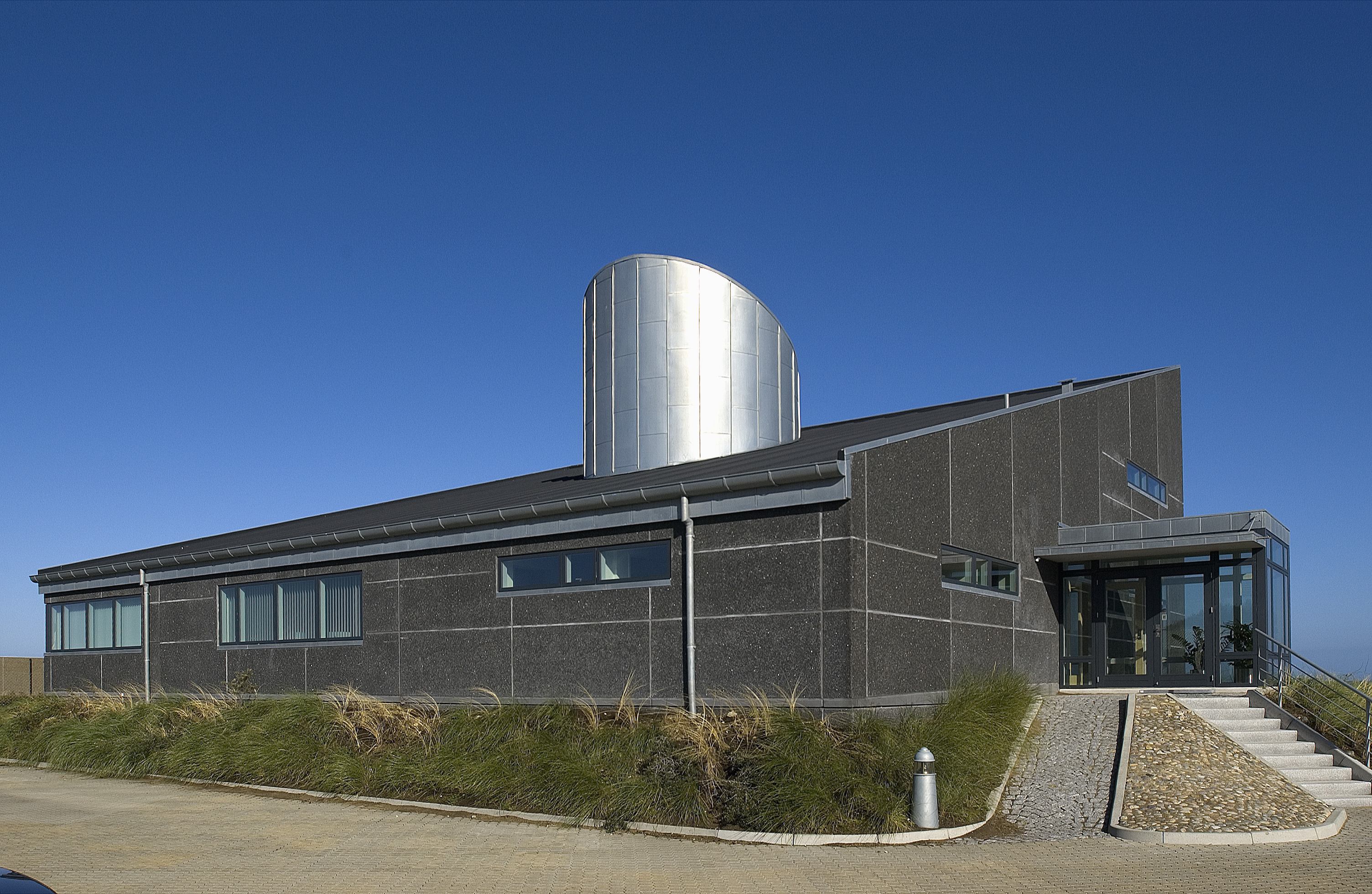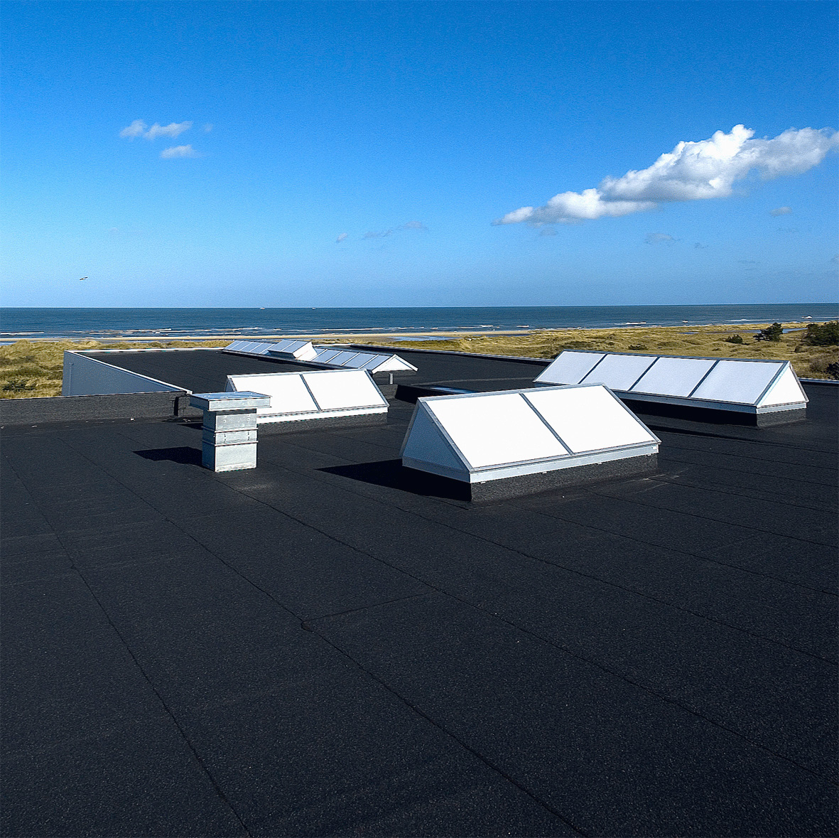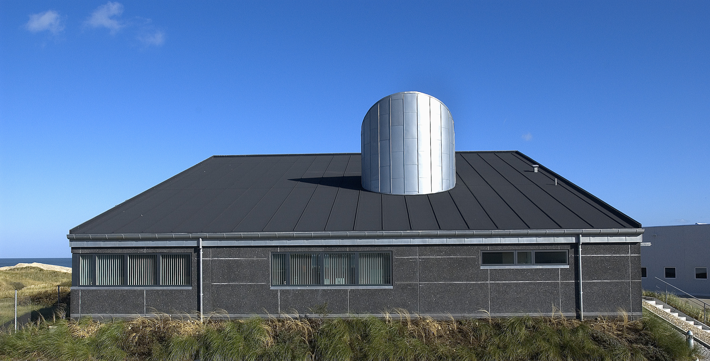 Til denne administrationsbygning, som ligger tæt på Vesterhavet, er valgt en kulsort tagpap, som harmonerer flot med de sorte betonvægge og grafitsorte vinduer.