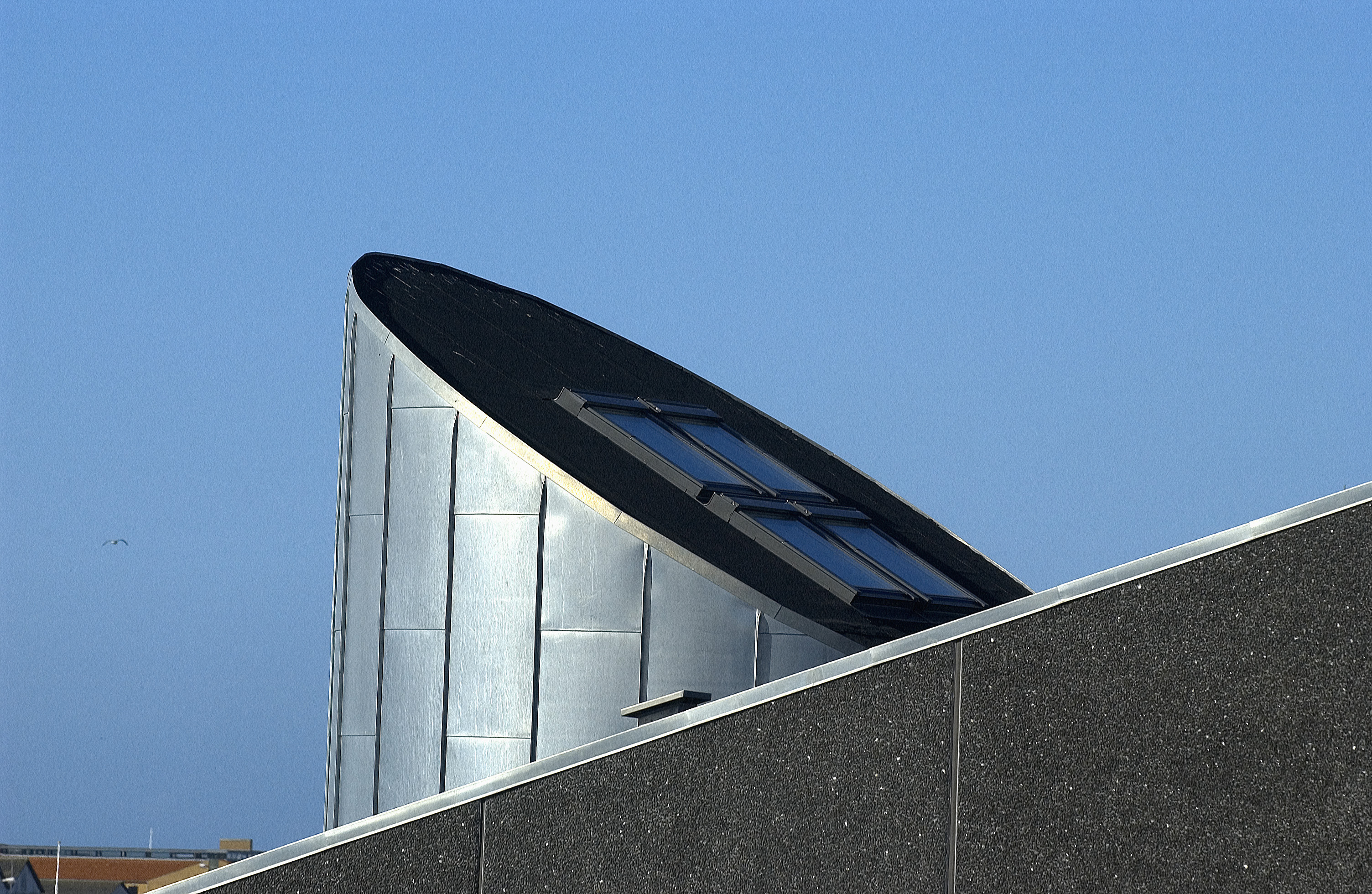 Den eksklusivt udseende tagpap står flot til facadens zinkbeklædning, der vender mod vandet, og trappetårnet samt vindskederne af zink. For at skabe struktur i taget er der listedækket med 90 cm afstand mellem listerne.