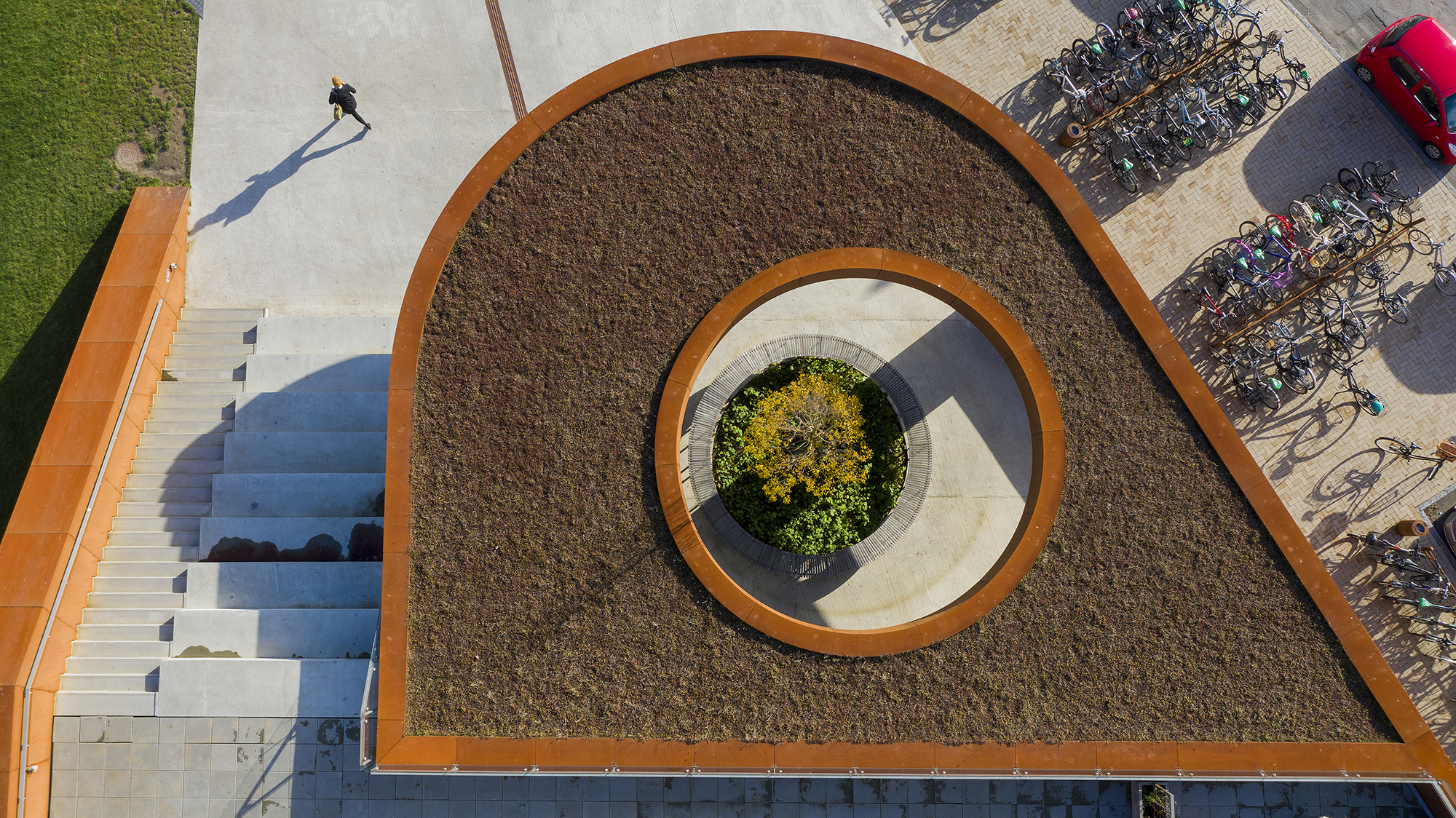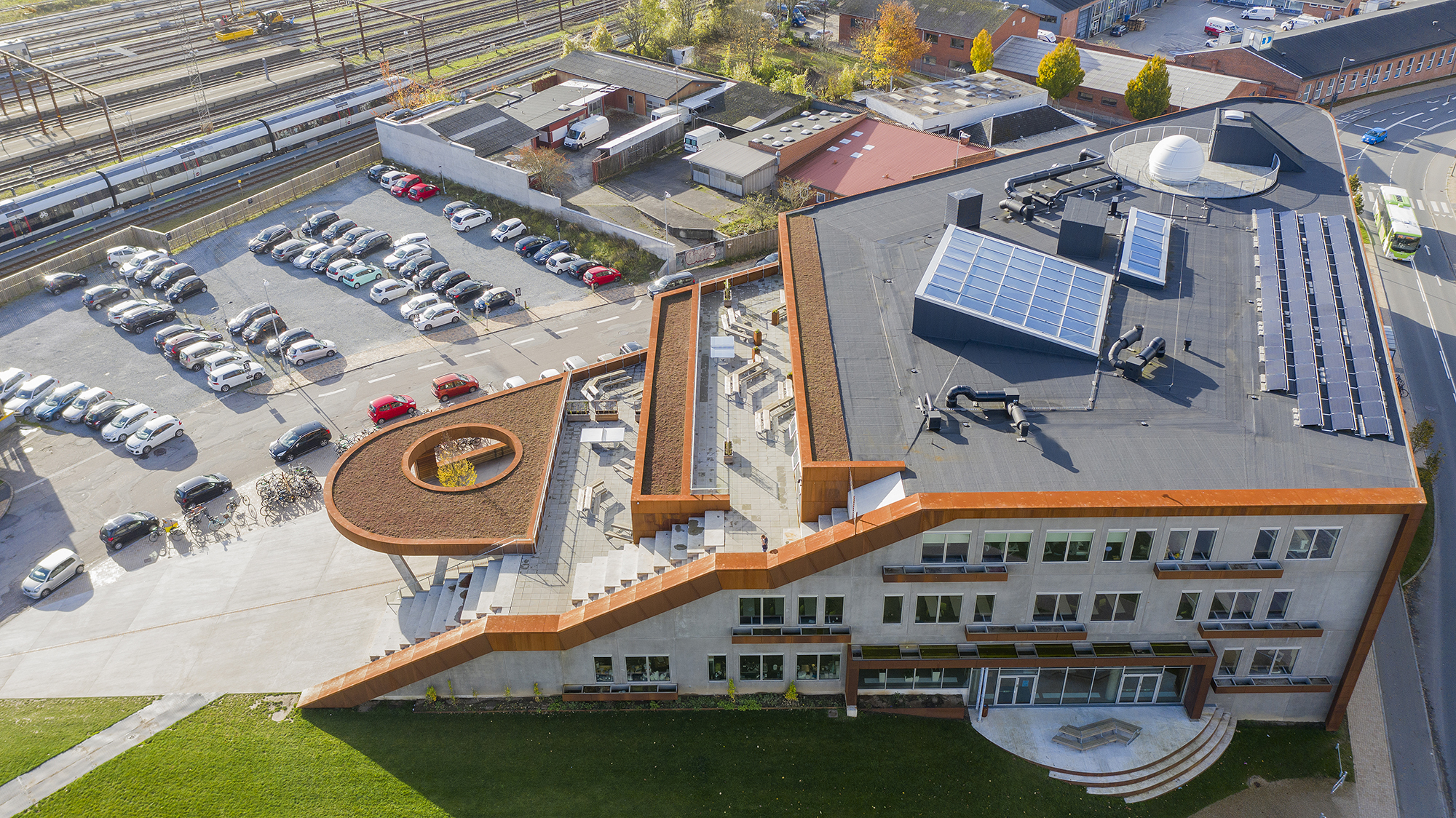 Med sine både afrundede former og skarpe vinkler, samt rå materialeholdning, fik bygningen en 2. plads i kampen som Årets skolebyggeri i 2019.