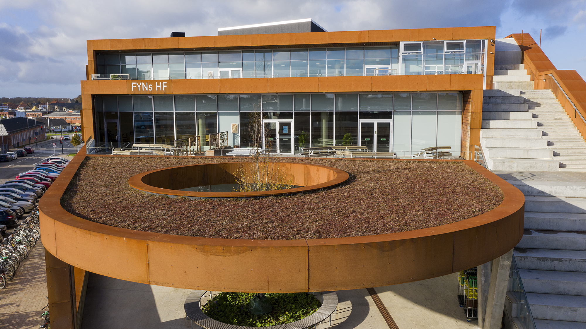 Med en central placering tæt på Byens Bro, har HF & VUC Fyn i Odense opført en undervisningsbygning som følger sin trekantede grund, og med opholdsterrasser mod syd. Bygningen blev færdiggjort i februar 2019 med et areal på 7725 kvm, fordelt på 3 etager.