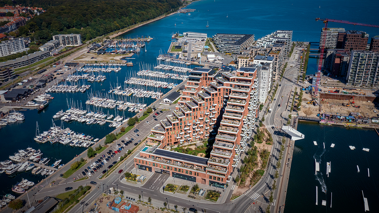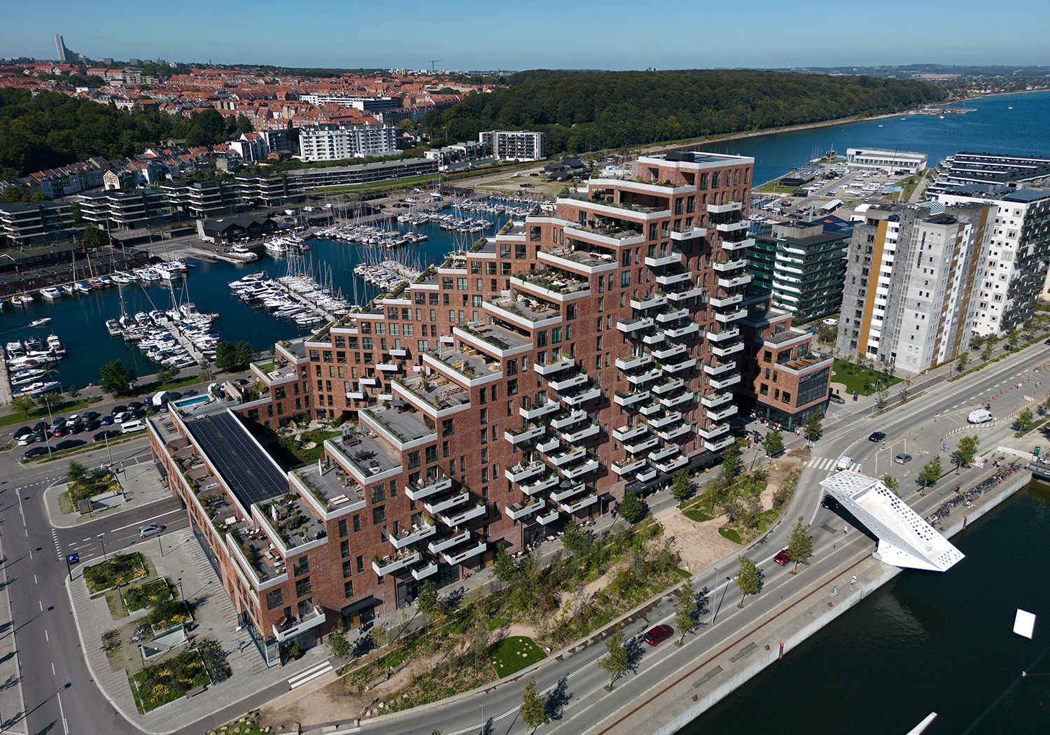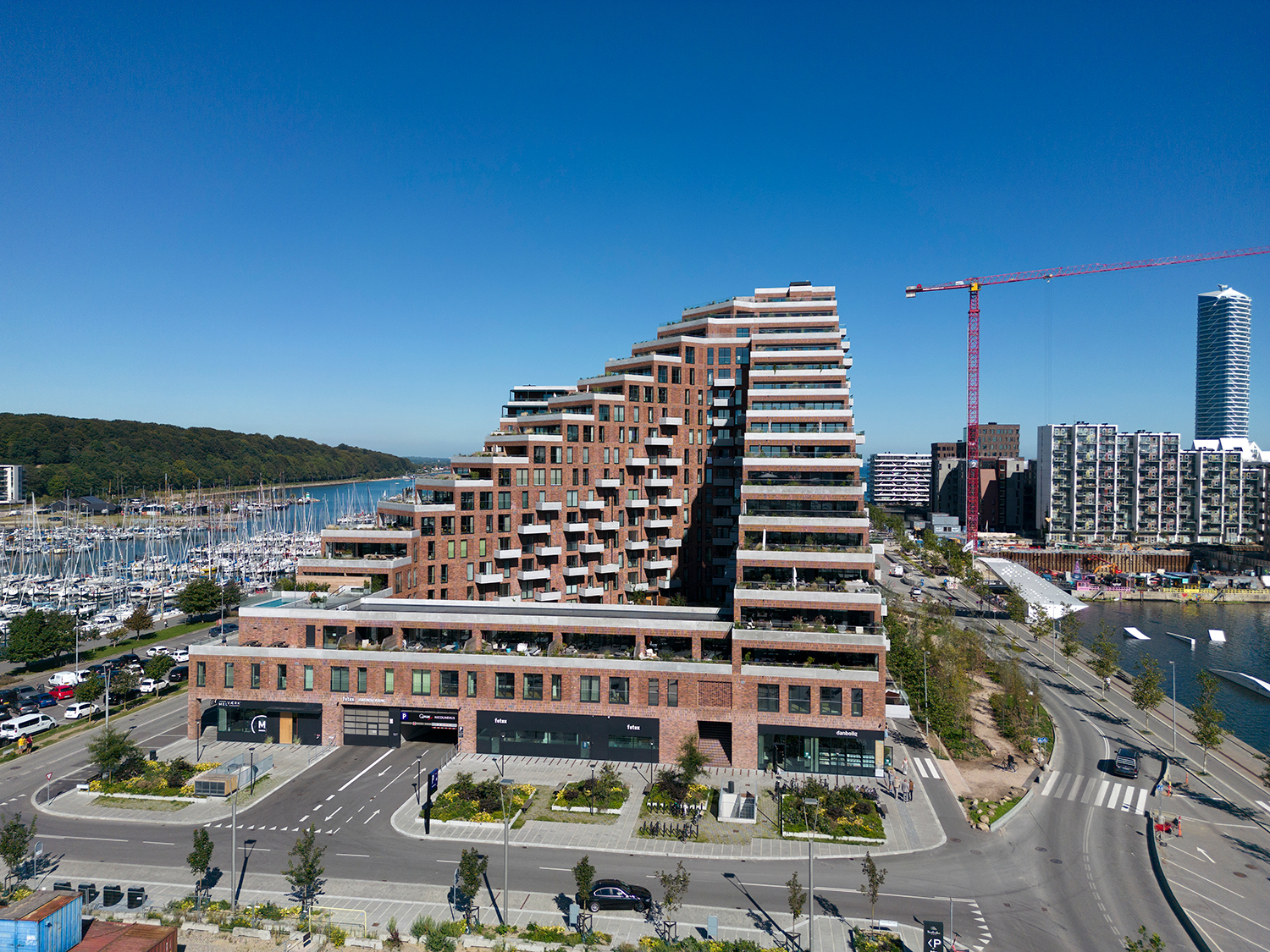 Skrå vinkler, varierende bygningshøjder, hævede gårdrum, tagterrasser og altaner præger arkitekturen, der både passer godt ind til andre byggerier i området, samtidig med at den taler med egen stemme. På en gang er det en funktionel bygning med bolig og erhverv, og udsigt til vand..