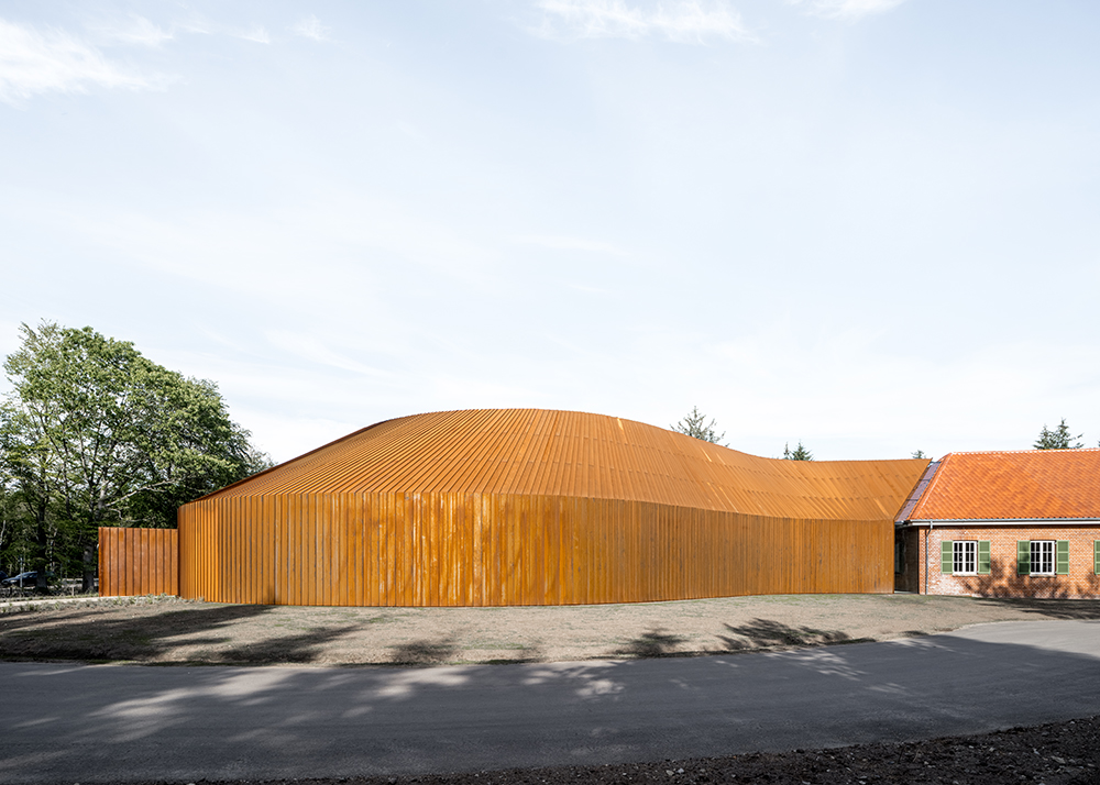 Ydersiden af den nye tilbygning er dækket af en bronzefarvet, cortenstålsklædt facade, der kurver sig mellem de to eksisterende bygningskroppe, forbindende to historiske bygninger – fortiden med nutiden.