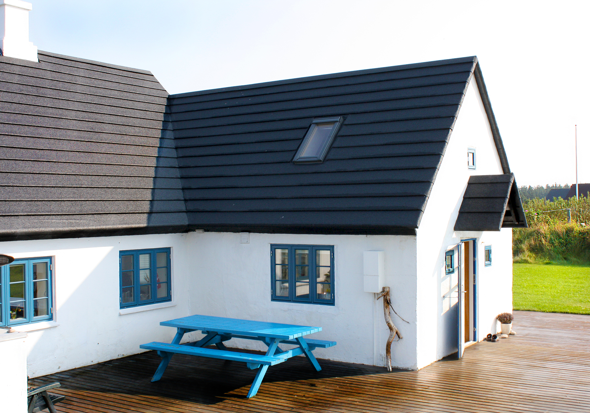 Her valgte ejeren en løsning, der harmonerer smukt med den særlige byggestil fra klitterne i Nordvestjylland: En pladedækning med tagpap, lagt omkring ”spåner”. Sådan blev mange af husene bygget i slutningen af 1800-tallet, men teknikken bruges ikke ret ofte længere.